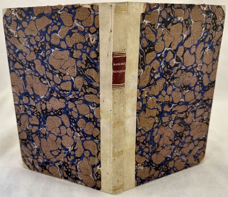 Edizione del 1866 di questo repertorio generale del codice civile per il Regno d'Italia a cura di Barchetta. Firma al frontespizio. L'opera in forma di dizionario elenca le varie voci del codice. In buone condizioni. Copertina in mezza pergamena con titolo e decorazioni in oro al dorso in ottime condizioni con lievi usure marginali. Legatura in buone condizioni. Pagine in buone condizioni generali con rare fioriture. In 8. Dim. 23x15 cm. Pp. 240.Edition of 1866 of this general repertory of the civil code for the Regno d'Italia byi Barchetta. Signature in the title page. The work in form of dicitonary lists all the voices of the code. In very good conditions. Half parchment coeval cover with gilted title in the spine in very good conditions lightly worn in the extremities. Binding in good conditions. Pages are in good conditions with occasional foxing. In 8. Dim. 23x15 cm. Pp. 240.