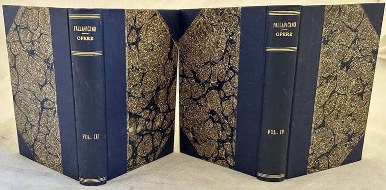 Edizione del 1844 dell'opera "Del bene" del Cardinale e storico Francesco Maria Sforza Pallavicino (1607-1667).<BR><BR>Volume appartenente alla collana "Biblioteca classica sacra o sia raccolta di opere religiose di celebri autori".<BR><BR>L'opera era composta da quattro tomi, siamo in possesso solo del terzo e quarto.<BR><BR>Segnalibro in seta celeste.<BR><BR>In ottime condizioni.<BR><BR>Copertina in mezza tela con titolo e decorazioni in oro al dorso in ottime condizioni generali con lievi usure ai margini e dorso. Legatura in buone condizioni. Pagine in ottime condizioni con rare fioriture. In 16. Dim. 16,5x11,5 cm. Pp. 330+(1), 363+(1). Edition of 1844 of this collection of works by the Cardinal and historian Francesco Maria Sforza Pallavicino (1607-1667).<BR><BR>Volume belonging to the series "Biblioteca classica sacra o sia raccolta di opere religiose di celebri autori".<BR><BR>The work was made up of four tomes, we only have the third and fourth tome.<BR><BR>Bookmark in light blue colour.<BR><BR>In very good conditions.<BR><BR>Half cloth cover with gilted title and decorations in the spine in very good conditions lightly worn in the extremities. Binding in good conditions. Pages in very good conditions with occasional foxing. In 16. Dim. 16,5x11,5 cm. Pp. 330+(1), 363+(1).