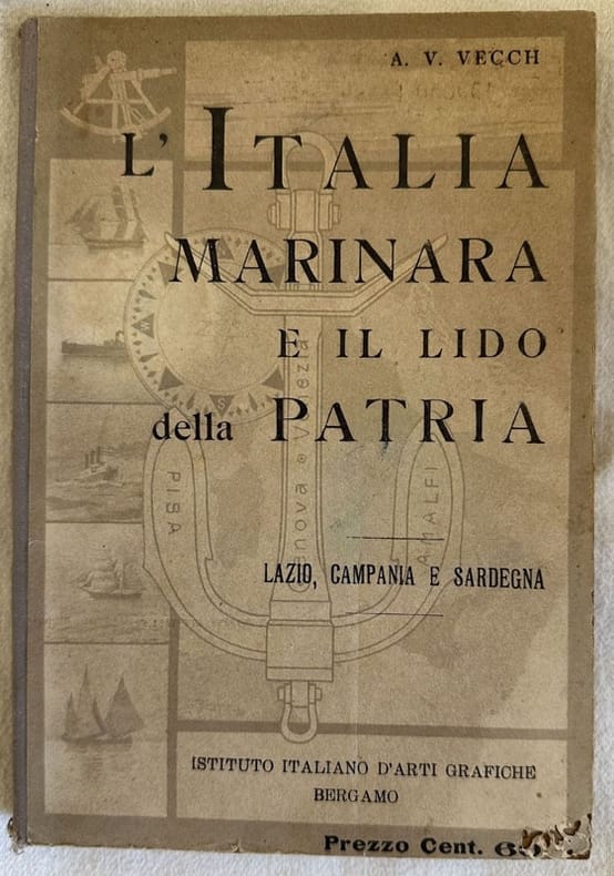 Edizione del 1901 di questo libro di letture ad uso delle regioni Lazio, Campania e Sardegna di A. V. Vecchi. Nella prima parte nozioni sull'Italia e il mare italiano, commercio marittimo, Prodotti commerciali del mare, Vari tipi di nave: Naviglio commerciale, peschereccio, militare, da diporto, professioni remunerative marittime, Meccanismo delle professioni marittime, doveri delle popolazioni litoranee.<BR> Nella seconda parte descrizione geografica e industriale del Lazio , Gaeta e le isole Pontine; Golfo di Napoli (Torre del Greco, acquario di Napoli, Castellammare, Penisola Sorrentina; Isole del Golfo di Napoli), Sardegna, Cagliari e il Capo di Sotto. Nella terza parte; Emigrazione, Scuole marittime, Illuminazione della Costa, Carità marittima ecc... Numerose figure nel testo. Mappa dell'Italia mancante. In buone condizioni. Copertina cartonata editoriale in buone condizioni generali con lievi usure ai margini e dorso. Piccoli segni di tarlo. Legatura in buone condizioni. All'interno le pagine si presentano in buone condizioni con fioriture. Mappa dell'Italia mancante. In 8. cm 19x13. Pp. 151Edition of 1901 of this book of reading for the regions of Lazio, Campania and Sardinia by A. V. Vecchi. In the first part notions about Italy and Italian sea, commercial products of the Sea, Ships In the second part geographical and industrial description of Lazio , Gaeta and isole Pontine; Golfo di Napoli (Torre del Greco, acquario di Napoli, Castellammare, Penisola Sorrentina; Isole del Golfo di Napoli), Sardegna, Cagliari e il Capo di Sotto. in the third part: Emigration, Sea schools, lightining of Coast, Sea mcharity ecc... Map of Italy lacks. Different figures in the text. In good conditions. Carton editorial cover in good general conditions lightly worn in the extremities. little wormings. Binding in good conditions. Inside pages are in good conditions with foxing. map of Italy lacks. In 8. cm 19x13. Pp. 151