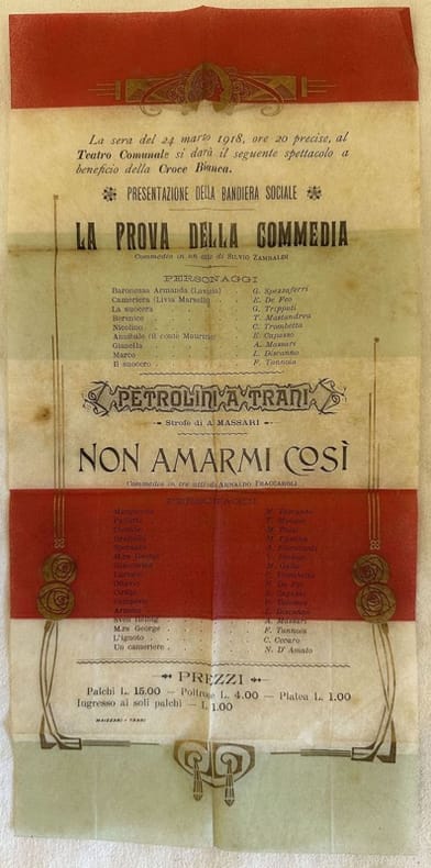 Locandina pubblicitaria del 24 marzo 1918 di due commedie da rappresentarsi al Teatro Comunale di Trani a beneficio della Croce Bianca. Si tratta del "La prova della commedia" di Silvio Zambaldi e "Non amarmi così" di Arnaldo Fraccaroli. Tra gli attori: Spezzaferri, De Feo, Tripputi, Mastandrea, Trombetta, Capasso, Massari, Discanno, Tannoia, Monaco, Puoti, Pastina, Fioravanti, Prologo, Gallo, Trombetta, Tolomeo, Discanno,Massari, Cecaro, D'Amato ecc... In ottime condizioni. Piegature. Formato cm. 38x19.Advertising poster of the 24th of march 1918 of two plays to be represented in the Teatro Comunale of Trani in the benfit to Croce Bianca. It is "La prova della commedia" by Silvio Zambaldi and "Non amarmi così" by Arnaldo Fraccaroli. The actors inside: Spezzaferri, De Feo, Tripputi, Mastandrea, Trombetta, Capasso, Massari, Discanno, Tannoia, Monaco, Puoti, Pastina, Fioravanti, Prologo, Gallo, Trombetta, Tolomeo, Discanno,Massari, Cecaro, D'Amato ecc... In very good conditions. Foldings. Size cm. 38x19.