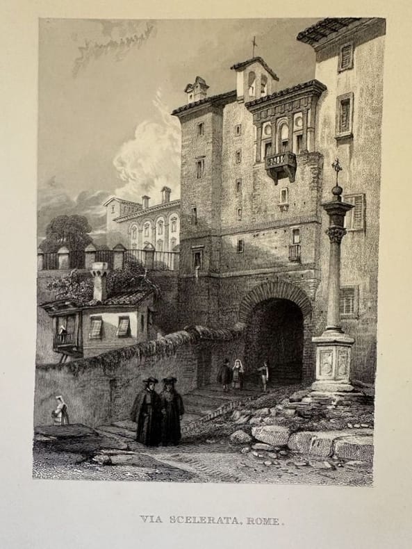 Veduta della celebre via Scelerata o Vicolo Scellerato a Roma. Si narra che il balcone sovrastante l'arco sia quello di Vannozza o Giovanna Cattanei amante di Papa Alessandro VI Borgia e che il luogo fu scenario di brutali assassini nell'Antica Roma e nella famiglia Borgia. Atlante: Rome and its surrounding scenery Data: 1840 circa Tecnica: Litografia Dimensione del foglio: 27,5x20,5 cm Dimensione incisione: 15,5x11,5 cm Condizioni: Buone. Alcune fioritureView of the famous via Scelerata or Vicolo Scellerato in Rome. The legends talks that the balcony is that of Vannozza or Giovanna Cattanei lover of the Pope Alessandro VI Borgia and that the scenery was place of bad lovers in Ancient Rome and in Borgia family. Atlas: Rome and its surrounding scenery Date: 1840 circa Technique: Lithography Leaf Dimension:27,5x20,5 cm Engraving Dimension: 15,5x11,5 cm Conditions: Good conditions. Some foxing.