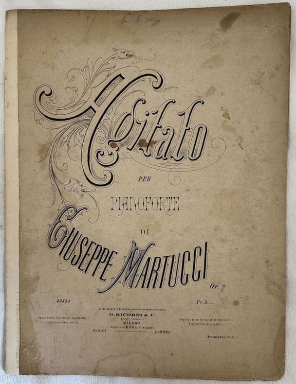 Edizione del maggio 1895 della melodia "Agitato" dall'opera 7 del compositore napoletano Giuseppe Martucci (1856-1909). Bel frontespizio figurato.In buone condizioni.Copertina editoriale in buone condizioni con lievi usure e strappi marginali. Dorso ricoperto da carta. Legatura in buone condizioni. Pagine in buone condizioni con rare fioriture. Strappo marginale. In folio. cm. 34x26. Pp. 5.Edition of may 1895 of the melody "Agitato" from the opera 7 by the neapoltan composer Giuseppe Martucci (1856-1909). Beautiful figurated title page. In good conditions Editorial cover in good conditions lightly worn with tears in the extremities. Spine covered by paper. Binding in good conditions. Pages in good conditions with occasional foxing. Tear in the edge. In folio. cm. 34x26. Pp. 5.