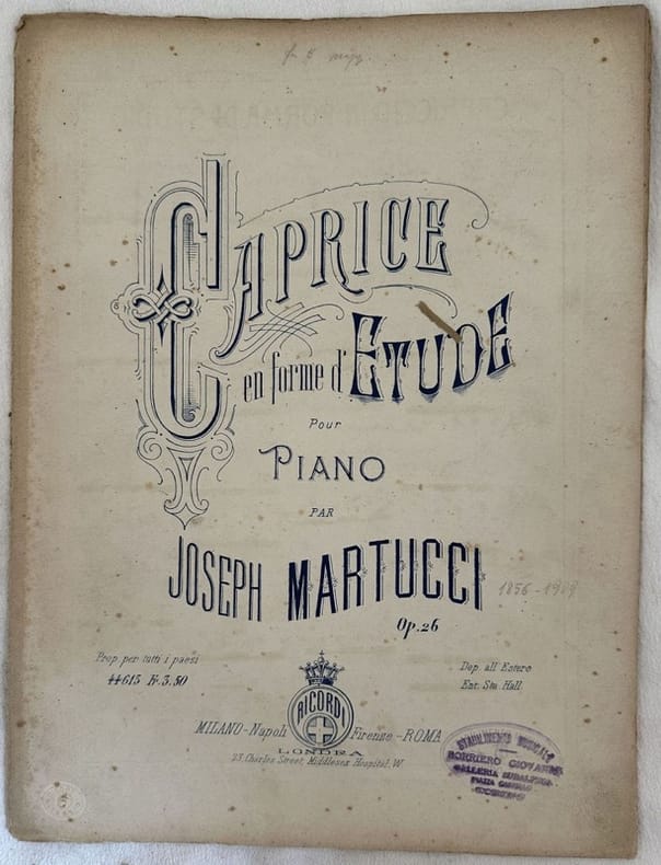 Edizione del giugno 1893 della melodia "Caprice en forme d'etude" dall'opera 26 del compositore napoletano Giuseppe Martucci (1856-1909). Bel frontespizio figurato.In buone condizioni.Copertina editoriale in buone condizioni con lievi usure marginali. Legatura in buone condizioni. Pagine in buone condizioni con rare fioriture. In folio. cm. 34,5x26. Pp. 9.Edition of june 1893 of the melody "Caprice en forme d'etude" from the opera 26 by the neapoltan composer Giuseppe Martucci (1856-1909). Beautiful figurated title page. In good conditions<BR>Editorial cover in good conditions lightly worn with tears in the extremities. Spine covered by paper. inding in good conditions. Pages in good conditions with occasional foxing. In folio. cm. 34,5x26. Pp. 9.