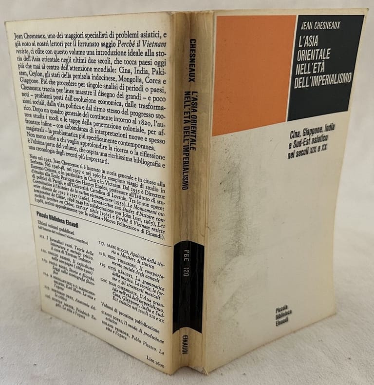 Edizione del 1966 di questa opera sull'Asia orientale nell'età dell'Imperialismo a cura di Jean Chesneaux. All'interno: L'Asia intorno al 1820-30, La penetrazione dell'Occidente nell'Asia Orientale, Il Giappone dall'era del Meiji al 1937, La Cina dalle guerre dell'oppio al 1937, I paesi del Sud Est Asiatico fino al 1941, L'India fino al 1939, L'Asia Orientale e la seconda guerra mondiale, Dalla capitolazione giapponese alla Conferenza di Bandlung, Alcune direttrici di ricerca ecc... In buone condizioni. Copertina editoriale in buone condizioni generali con lievi usure ai margini e dorso. Legatura in buone condizioni. All'interno le pagine si presentano in buone condizioni con rare fioriture. In 16. Dim. 18x10,5 cm. Pp. 361+(6).Edition of 1966 of this work about Oriental Asia during the age of Imperialism by Jean Chesneaux. Inside: L'Asia intorno al 1820-30, La penetrazione dell'Occidente nell'Asia Orientale, Il Giappone dall'era del Meiji al 1937, La Cina dalle guerre dell'oppio al 1937, I paesi del Sud Est Asiatico fino al 1941, L'India fino al 1939, L'Asia Orientale e la seconda guerra mondiale, Dalla capitolazione giapponese alla Conferenza di Bandlung, Alcune direttrici di ricerca ecc... In good conditions. Editorial cover in good conditions lightly worn in the extremities. Binding in good conditions. Inside pages are in good conditions with occasional foxing. In 16. Dim. 18x10,5 cm. Pp. 361+(6).