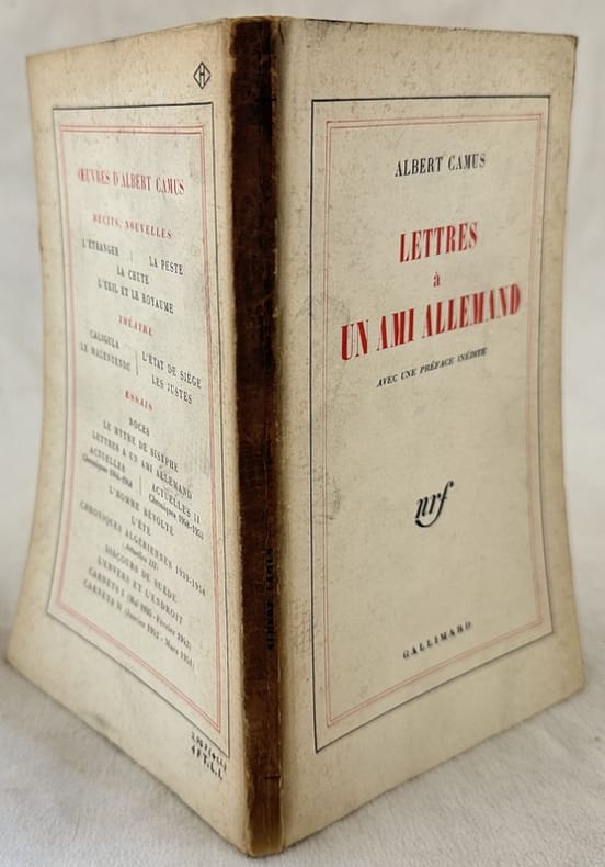 Ristampa dell'ottobre 1964 dell'edizione del 1948 di questa opera del filosofo, autore scrittore di opere di teatro, giornalista Albert Camus (1913-1960). Prefazione all'edizione italiana. L'opera è una raccolta di quattro lettere a un anonimo amico tedesco. Lingua francese. In buone condizioni. Copertina editoriale in buone condizioni generali con lievi usure ai margini e dorso. Legatura in buone condizioni. All'interno le pagine si presentano in ottime condizioni con rare fioriture. In 8. cm. 19x12. Pp. 81+(6).Republishing of the october 1964 of the edition of 1948 of this work by the phylosopher, dramawriter and journalist Albert Camus (1913-1960). Prefation to italian edition. The work is a collcetion of four letters to an anonymous german friend. French language. In good conditions. Editorial cover in good general conditions lightly worn in the extremities. Binding in good conditions. Inside pages are in very good conditions with occasional foxing. In 8. cm. 19x12. Pp. 81+(6).