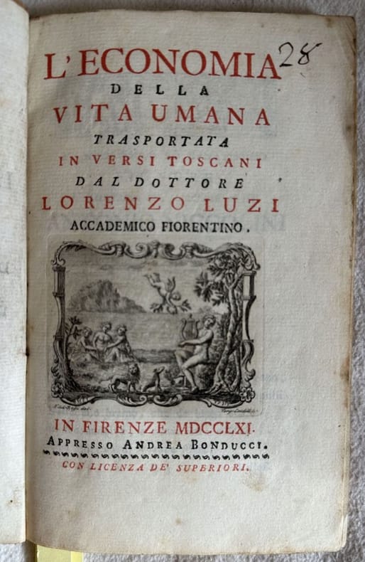Edizione fiorentina del 1761 di questo trattato di morale in stile orientale di autore anonimo ma attribuita a Robert Dodsley (1703-1764) (Cfr. Melzi G., Dizionario delle opere anonime e pseudonime, V. 1 p. 341). Traduzione a cura di Lorenzo Luzi a differenza della precedente edizione napoletana che venne tradotta da Luigi Guidelli. Vignetta calcografica sul frontespizio disegnata da Filidoro Rossi e incisa da Virgilio Cordelli. lo stampatore Bonducci dichiara nell'introduzione ai lettori che non è chiara la paternità dell'opera: se si tratta di un manoscritto proveniente dal Tibet "uscito dall'Archivio del Gran Lama" o un'opera di Dodley "Letterato e Pari d'Inghilterra estratto per il medesimo dai libri Sacri". Antica nota manoscritta all'occhietto e frontespizio. In buone condizioni. Copertina morbida coeva con titolo manoscritto al dorso in buone condizioni. Legatura in buone condizioni. All'interno le pagine si presentano in buone condizioni con rare fioriture. In folio. Dim. 32x22 cm. Pp. XV+(1)+93+(1). Florentine edition of 1761 of this moral treaty in oriental style of anonymous author but attributed to Robert Dodsley (1703-1764) (Cfr. Melzi G., Dizionario delle opere anonime e pseudonime, V. 1 p. 341). Translation by Lorenzo Luzi, but the previous neapolitan edition was translated by Luigi Guidelli. Calcographic vignette in the title page drawn by Filidoro Rossi and engraved by Virgilio Cordelli. The publisher Bonducci declares in the introduction to readers that the origin of the book is not clear: it can be a manuscript coming from Tibet "uscito dall'Archivio del Gran Lama" or a work of Dodley "Letterato e Pari d'Inghilterra estratto per il medesimo dai libri Sacri". Ancient handwritten note in the false title page and title page. In good conditions. Soft coeval cover with ahndwritten title in the spine in good conditions lightly worn in the extremities. Binding in good conditions. Inside pages are in good conditions with occasional foxing. In folio. Dim. 32x22 cm. Pp. XV+(1)+93+(1). <BR><BR>