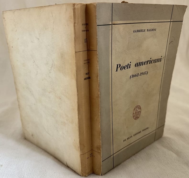 Edizione del 1949 di questa monografia sui poeti americani (1662-1945) a cura di Gabriele Baldini della collana "Maestri e Compagni". Alcune tavole fuori testo All'ìinterno: Primer, Bradstreet, Wigglesworth, Taylor, Pain, Trumbull, Barlow, Freneau, Cullen Bryanz, Allan Poe, Waldo Emerson, Thoreau, Lowell, Whittier, Longfellow, Timrod, Lanier, Whitmann, Hay, Dunbar, Melville, Dickinson, Arlington Robinson, Lindsay, Lowell, Lee Masters, Frost, Sandburg, Jeffers, Pound, Eliot, Stevens, Cummings, Tate, Crane, Mac Leifs, Moore ecc... In buone condizioni. Copertina editoriale in buone condizioni generali con lievi usure ai margini e dorso. Legatura in buone condizioni. All'interno le pagine si presentano in buone condizioni con rare fioriture. In 8. Dim. 21x14,5 cm. Pp. XXXIII+434.Edition of 1949 of this monography about american poets (1662-1945) by Gabriele Baldini of the series "Maestri e Compagni". Some out of text plates Inside: Primer, Bradstreet, Wigglesworth, Taylor, Pain, Trumbull, Barlow, Freneau, Cullen Bryanz, Allan Poe, Waldo Emerson, Thoreau, Lowell, Whittier, Longfellow, Timrod, Lanier, Whitmann, Hay, Dunbar, Melville, Dickinson, Arlington Robinson, Lindsay, Lowell, Lee Masters, Frost, Sandburg, Jeffers, Pound, Eliot, Stevens, Cummings, Tate, Crane, Mac Leifs, Moore ecc... In good conditions. Editorial cover in goodgeneral conditions lightly worn in the extremities. Binding in good conditions. Inside pages are in good conditions with occasional foxing. In 8. Dim. 21x14,5 cm. Pp. XXXIII+434.<BR><BR>