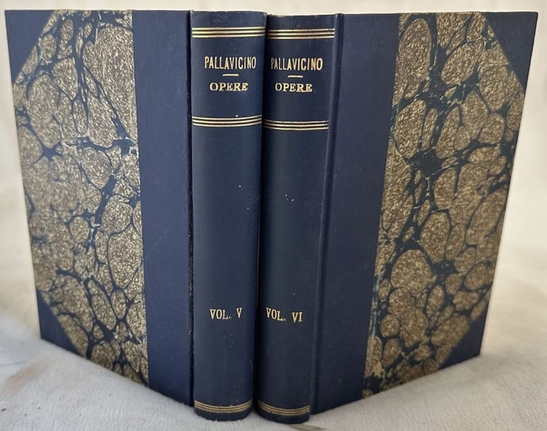 Edizione del 1844 dell'opera "Arte della perfezion cristiana" del Cardinale e storico Francesco Maria Sforza Pallavicino (1607-1667). Volume appartenente alla collana "Biblioteca classica sacra o sia raccolta di opere religiose di celebri autori". L'opera è in due tomi ed è completa. Segnalibro in seta celeste. In ottime condizioni. Copertina in mezza tela con titolo e decorazioni in oro al dorso in ottime condizioni generali con lievi usure ai margini e dorso. Legatura in buone condizioni. Pagine in ottime condizioni con rare fioriture. In 16. Dim. 16,5x11,5 cm. Pp. 323+(1), 319+(3). Edition of 1844 of this collection of works by the Cardinal and historian Francesco Maria Sforza Pallavicino (1607-1667). Volume belonging to the series "Biblioteca classica sacra o sia raccolta di opere religiose di celebri autori". The work is made up of two tomes and it is complete. Bookmark in light blue colour. In very good conditions. Half cloth cover with gilted title and decorations in the spine in very good conditions lightly worn in the extremities. Binding in good conditions. Pages in very good conditions with occasional foxing. In 16. Dim. 16,5x11,5 cm. Pp. 323+(1), 319+(3).