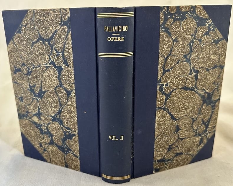 Edizione del 1844 dell'opera "Del bene" del Cardinale e storico Francesco Maria Sforza Pallavicino (1607-1667).<BR><BR>Volume appartenente alla collana "Biblioteca classica sacra o sia raccolta di opere religiose di celebri autori".<BR><BR>L'opera era composta da quattro tomi, siamo in possesso solo del terzo e quarto.<BR><BR>Segnalibro in seta celeste.<BR><BR>In ottime condizioni.<BR><BR>Copertina in mezza tela con titolo e decorazioni in oro al dorso in ottime condizioni generali con lievi usure ai margini e dorso. Legatura in buone condizioni. Pagine in ottime condizioni con rare fioriture. In 16. Dim. 16,5x11,5 cm. Pp. 330+(1), 363+(1). Edition of 1844 of this collection of works by the Cardinal and historian Francesco Maria Sforza Pallavicino (1607-1667).<BR><BR>Volume belonging to the series "Biblioteca classica sacra o sia raccolta di opere religiose di celebri autori".<BR><BR>The work was made up of four tomes, we only have the third and fourth tome.<BR><BR>Bookmark in light blue colour.<BR><BR>In very good conditions.<BR><BR>Half cloth cover with gilted title and decorations in the spine in very good conditions lightly worn in the extremities. Binding in good conditions. Pages in very good conditions with occasional foxing. In 16. Dim. 16,5x11,5 cm. Pp. 330+(1), 363+(1).
