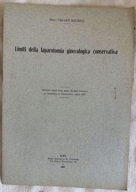 Pubblicazione del 1937, i limiti della laparotomia ginecologica conservativa di Cesare Micheli. Estratto dagli Atti della Società Italiana di Ostetricia e Ginecologia del 1937. In buone condizioni. Brossura editoriale in buone condizioni generali con lievi usure ai margini e dorso. Legatura in ottime condizioni. Pagine in buone condizioni con rare fioriture. In 8. cm 24x17. Pp. 7.Pamphlet of 1937 by Cesare Micheli. Extract from Atti della Società Italiana di Ostetricia e Ginecologia del 1937. In good conditions. Editorial cover in good general conditions lightly worn in the extremities. Binding in very good conditions. Pages in good conditions with occasional foxing. In 8. cm 24x17. Pp. 7.