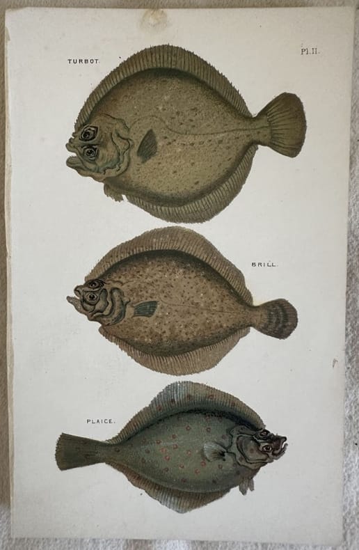 Cromolitografia originale del 1882 che mostra tre pesci ampiamente utilizzati in cucina. Data: 1882 Autore: Henry Reeve Atlante: Cookery and housekeeping Tecnica: cromolitografia Dimensione del foglio: 180x115 mm Dimensione incisione: 160x80 mm Condizioni: Ottime. Rare fioriture. Chromolithography of 1882 representing six fishes widely used in kitchen. Date: 1882 Author: Henry Reeve Atlas: Cookery and housekeeping Technique: chromolithography Size of the page: 180x115 mm Size of the engraving: 150x85 mm Conditions: Very good conditions. Occasional foxing<BR><BR>