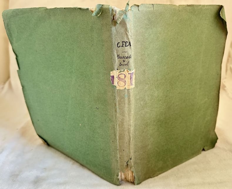 Rara raccolta di sette pubblicazioni dell'avvocato, archeologo e collezionista d'arte Carlo Fea (Pigna 1753-Roma 1836). Fea fu direttore del Museo Capitolino e Commissario delle Antichità di Roma. Si occupò di razionalizzare la legislazione sul commercio in antichità e sugli scavi archeologici e intraprese opere di scavo al Pantheon e Foro Romano. <BR><BR>Miscellanea di studi che parla soprattutto di Tivoli ma anche diffusamente di Ostia, Fiumicino, la Valle della Caffarella e altri luoghi limitrofi. Lozzi 5354. Bocca 5958 (solo il primo articolo sul disastro di Tivoli)<BR><BR>Le memorie contenute: Considerazioni storiche, fisiche geologiche, idrauliche, architettoniche economiche critiche sul disastro accaduto in Tivoli il di 16 novembre 1826; Schiarimenti ai Signori professori del Consiglio d'arte sulle Difficoltà che i medesimi hanno proposte nel loro parere intorno al pogetto dell'autore per rimediare a quelle rovine; Parere e progetto del consiglio d'arte sulla riparazione della rotta dell'Aniene a Tivoli esaminato; Osservazioni sopra il condotto dell'acqua felice nella sua origine a Pantano per rimediare ai danni che vi sono nella quantita e qualita dell'acqua; Supplemento alle notizie date nella relazione d'un viaggio a Ostia e nelle osservazioni sulla Fossa Traianna intorno al canale detto Fiumicino; Scoperta dell'antica acqua di Mercurio presso la Porta Capena da condottarsi a benefizio pubblico; Un lago salutare degli antichi fuori la Porta Capena scoperto nel cosi detto antro della Ninfa Egeria ossia Fontana Bella nella Valle della Caffarella.<BR><BR>Alla fine dell'opera quattro tavole ripiegate.<BR><BR>In buone condizioni.<BR><BR>Copertina morbida coeva con titolo manoscritto al dorso in buone condizioni general con lievi usure marginali. Legatura in buone condizioni. Pagine in ottime condizioni con rare fioriture. In 4. cm 30x23. Pp. IV+184+4 pl..