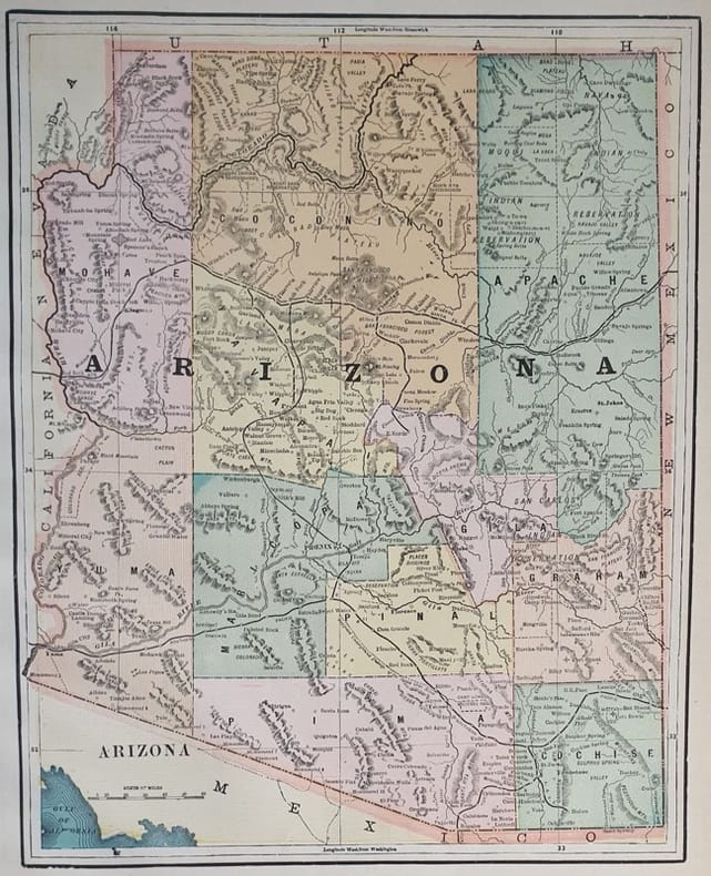 Bellissima mappa colorata dell'Arizona. Al verso mappa colorata di New Mexico. Autore: George F. Cram Atlante: Standard American atlas of the world Data: 1890 circa Tecnica: litografia Dimensione del foglio: 36,5x29 cm Dimensione dell'incisione: 30,5x26 cm Condizioni:Buone. Very beautiful page coloured map of Arizona In the verso coloured map of New Mexico.<BR><BR>Author: George F. Cram Atlas: Standard American atlas of the world Date: 1890 circ Technique: lythography Leaf Dimension: 36,5x29 cm Engraving Dimension: 30,5x26 cm Conditions: Good conditions.