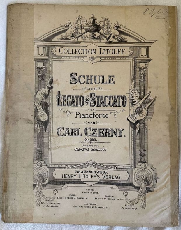Edizione della fine dell'ottocento o inizi novecento della melodia "Schule des legato und staccato" dall'opera 335 del compositore austriaco insegnante e pianista Carl Czerny (1791-1857) Decorazioni in copertina. In mediocri condizioni. Copertina editoriale in discrete condizioni con usure marginali. Rinforzo ai margini e dorso. Legatura quasi assente. Pagine in discrete condizioni con fioriture. In Folio. cm. 30x24. Pp. 87.Edition of late 19th century of early 20th century of the melody "Schule des legato und staccato" from the opera 335 by the austrian composer teacher and piano player Carl Czerny (1791-1857) Decorations in the cover. In poor conditions Editorial cover in fair conditions with wearings in the extremities. Reinforcements in the spine and edges. Binding almost missing. Pages in fair conditions with foxing. In Folio. cm. 30x24. Pp. 87