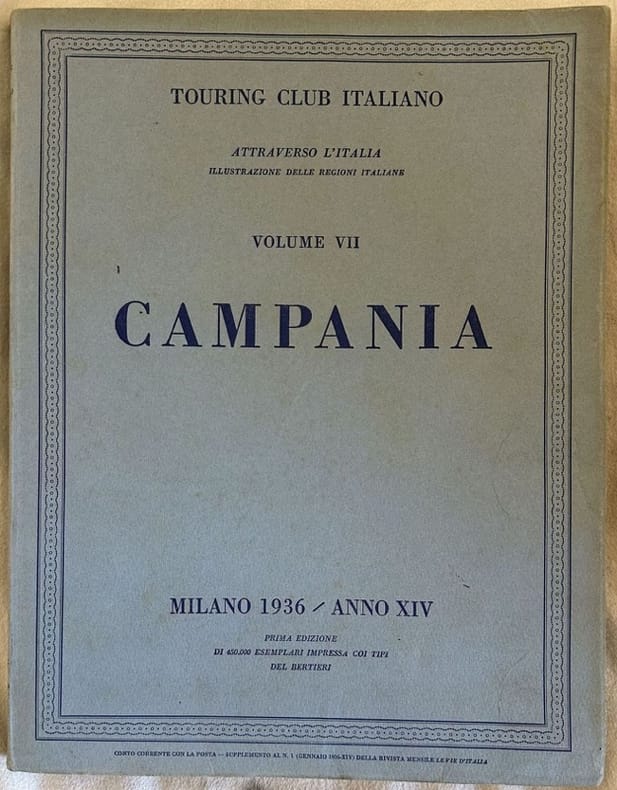 Edizione del 1936 di questa opera edita dal Touring club italiano sulla regione Campania. L'opera è composta da un volume ed è completa. All'interno: Napoli, Marechiaro, PArco della Rimembranza, Capo di Coroglio, Cratere di Agnano, Nisida e Golfo di Pozzuoli, Campi Flegrei, Monte Nuovo, Lago Lucrino, Lago D'Averno, Monte Nuovo, Baia, Bacoli, Miseno, Arco felice, Cuma, Ischia, Serrara, Forio, Casamicciola, Vesuvio, M. Somma, Ercolano, Pompei, Portici, Torre del Greco, Torre Annunziata, Pompei, Gragnano, Castellammare di Stabia, Agerola, Monte Faito, Sant'Agata, Vico Equense, Sorrento, Massalubrense, isola di Capri, Anacapri, Castello Barbarossa, Atella, Frattamaggiore, Acerra, Aversa, Nola, Cimitile, Arienzo S. Felice, Caserta, S. Maria Capua Vetere, Capua, Calvi Risorta, Teano, Vairano Patenora, Carinola, Ventaroli, Roccamonfina, Sessa Aurunca, Benevento, Sannio Campano, Caiazzo, Alife, Telese, Guardia Sanframondi, Pontelandolfo, Colle Sannita, Castelvetere Val Fortore, S.Nicola Manfredi, Solopaca, Montesarchio, S. Agata de Goti, Avellino, Irpinia, Montecalvo Irpino, S. Angelo dei Lombardi, Montefalcione, Frigento, Solofra, Rocca S. Felice, Valle Ufita, Montella, Bagnoli Irpino, Salerno, Vietri, Maiori, Amalfi, Amalfi, Ravello, Scala, Positano, Vallone di Furore, Cava dei Tirreni, Nocera Inferiorem Pagani, Sarno, Eboli, Castelcivita, Sicignano, Polla, Atena Lucana, Sala Consilina, Padula, Tegiano, Torre Orsaia, Vallo della Lucania, Policastro, Pisciotta, Agropoli, Piana di Pesto, Paestum ecc.. Numerose fotografie in bianco e nero e qualcuna a colori mostrano diverse vedute e panorami. Una mappa della Campania. In buone condizioniCopertina editoriale in buone condizioni generali con lievi usure ai margini e dorso. Legatura in buone condizioni. All'interno le pagine si presentano in buone condizioni con rare fioriture. In 4. Dim. 29x22,5 cm. Pp. 237+(3). Peso Kg. 0,800Edition of 1936 of this work edited by Touring club italiano about the region of Campania. The work is in one volume and it is complete. Inside: Napoli, Marechiaro, PArco della Rimembranza, Capo di Coroglio, Cratere di Agnano, Nisida e Golfo di Pozzuoli, Campi Flegrei, Monte Nuovo, Lago Lucrino, Lago D'Averno, Monte Nuovo, Baia, Bacoli, Miseno, Arco felice, Cuma, Ischia, Serrara, Forio, Casamicciola, Vesuvio, M. Somma, Ercolano, Pompei, Portici, Torre del Greco, Torre Annunziata, Pompei, Gragnano, Castellammare di Stabia, Agerola, Monte Faito, Sant'Agata, Vico Equense, Sorrento, Massalubrense, isola di Capri, Anacapri, Castello Barbarossa, Atella, Frattamaggiore, Acerra, Aversa, Nola, Cimitile, Arienzo S. Felice, Caserta, S. Maria Capua Vetere, Capua, Calvi Risorta, Teano, Vairano Patenora, Carinola, Ventaroli, Roccamonfina, Sessa Aurunca, Benevento, Sannio Campano, Caiazzo, Alife, Telese, Guardia Sanframondi, Pontelandolfo, Colle Sannita, Castelvetere Val Fortore, S.Nicola Manfredi, Solopaca, Montesarchio, S. Agata de Goti, Avellino, Irpinia, Montecalvo Irpino, S. Angelo dei Lombardi, Montefalcione, Frigento, Solofra, Rocca S. Felice, Valle Ufita, Montella, Bagnoli Irpino, Salerno, Vietri, Maiori, Amalfi, Amalfi, Ravello, Scala, Positano, Vallone di Furore, Cava dei Tirreni, Nocera Inferiorem Pagani, Sarno, Eboli, Castelcivita, Sicignano, Polla, Atena Lucana, Sala Consilina, Padula, Tegiano, Torre Orsaia, Vallo della Lucania, Policastro, Pisciotta, Agropoli, Piana di Pesto, Paestum ecc... One map of Campania. Inside there are different black and white and coloured photoes. In good conditions. Editorial cover in good conditions lightly worn in the extremities. Binding in good conditions. Inside pages are in good conditions with occasional foxing. In 4. Dim. 29x22,5 cm. Pp. 237+(3). Peso Kg. 0,800