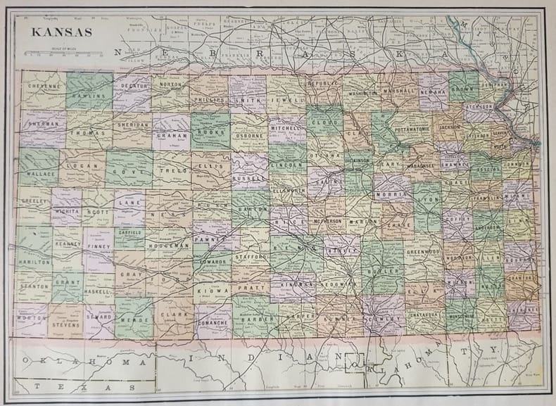 Bellissima mappa colorata dell'Kansas. Al verso mappa colorata di Omaha. Autore: George F. Cram Atlante: Standard American atlas of the world Data: 1890 circa Tecnica: litografia Dimensione del foglio: 36,5x29 cm Dimensione dell'incisione: 35x25 cm Condizioni:Buone. Very beautiful page coloured map of Kansas In the verso coloured map of Omaha. Author: George F. Cram Atlas: Standard American atlas of the world Date: 1890 circa Technique: lythography Leaf Dimension: 36,5x29 cm Engraving Dimension: 35x25 cm Conditions: Good conditions. <BR><BR>
