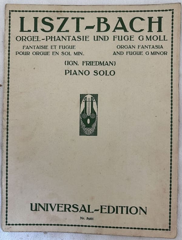 Edizione degli anni '30 della melodia "Orgel-phantasie und fuge G moll di Johann Sebastian Bach" di Franz Liszt (1811-1886). In buone condizioni. Copertina editoriale in buone condizioni con lievi usure marginali. Legatura in buone condizioni. Pagine in ottime condizioni con rare fioriture. In 4. cm. 30,5x23. Pp. 15.Edition of 1930's of the melody "Orgel-phantasie und fuge G moll di Johann Sebastian Bach" by Franz Liszt (1811-1886). In good conditions. Editorial cover in good conditions lightly worn in the extremities. Binding in good conditions. Pages in very good conditions with occasional foxing. In 4. cm. 30,5x23. Pp. 15.