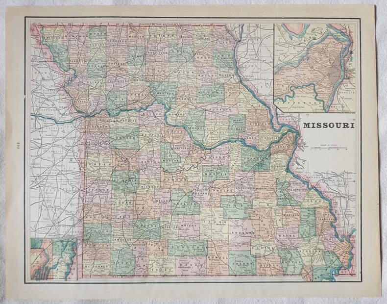 Bellissima mappa colorata del Missouri. Al verso mappa colorata di Minneapolis. Autore: George F. Cram Atlante: Standard American atlas of the world Data: 1890 circa Tecnica: litografia Dimensione del foglio: 36,5x29 cm Dimensione dell'incisione: 33x23 cm Condizioni:Buone. Very beautiful page coloured map of Kansas In the verso coloured map of Omaha. Author: George F. Cram Atlas: Standard American atlas of the world Date: 1890 circa Technique: lythography Leaf Dimension: 36,5x29 cm Engraving Dimension: 33x23 cm Conditions: Good conditions. <BR>