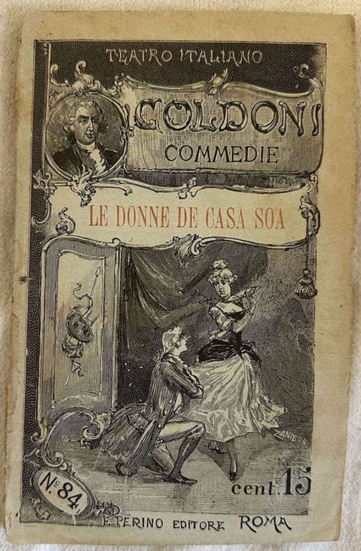 Edizione Perino del 1892 della commedia "Le donne di casa soa" di Carlo Goldoni della collana "Teatro italiano". Sono presenti due incisioni a piena pagina, una delle quali in antiporta.In buone condizioni. Copertina editoriale in buone condizioni con lievi usure marginali. Legatura in buone condizioni. Pagine in buone condizioni generali con fioriture. In 16. Dim. 17,5x11 cm. Pp. 63.Perino edition of 1892 della commedia "Le donne di casa soa" by Carlo Goldoni of the series "Teatro italiano". Inside there are two engravings, one of them in the frontspice. In fair conditions. Editorial cover in good conditions lightly worn in the extremities. Binding in good conditions. Pages are in good conditions with foxing. In 16. Dim. 17,5x11 cm. Pp. 63.