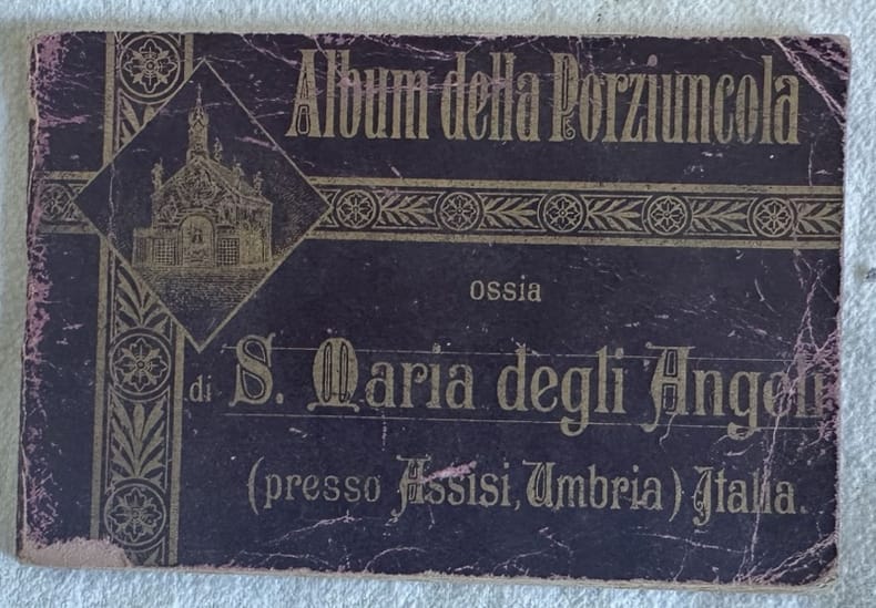 Piccolo Album fotografico del 1900 sui Santuari Francescani di Santa Maria degli Angeli e Assisi a cura del Padre Bernardino Ibald. All'interno sono presenti 15 tavole a piena pagina in bianco e nero che mostrano Santa MAria degli Angeli, la Basilica, il suo interno, la Porziuncola, Cappella di San Francesco, Veduta di Assisi e Santa Maria degli Angeli a doppia pagina, Il roseto, il tugurioTomba di San Francesco e Santa Chiara, San Damiano, Le Carceri ecc.. Testo esplicativo. Il libretto veniva offerto all'interno del Santuario in cambio di un'offerta. In buone condizioni. Copertina editoriale in buone condizioni generali con lievi usure marginali. Legatura in buone condizioni. Pagine in buone condizioni con fioriture. In 24. cm 9,5x14. Pp. 20+(15) pl..