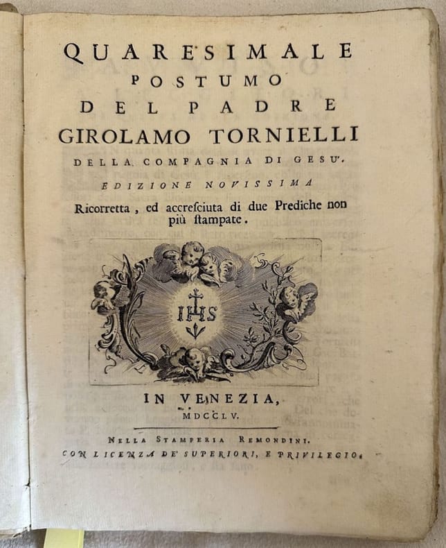 Edizione Remondini del 1755 di questo quaresimale del Padre Girolamo Tornielli (1693-1752) poeta e religioso italiano.All'interno una serie di prediche: Fondamento della Fede, Credibilità della Fede, Passione, Giudizio Finale, Massime, Pericoli di peccare, Purgatorio, SPeranza e disperazione dei peccatori, Educazione dei figliuoli, Dell'inferno pena del senso, Dell'interesse, Dello stato di peccato, Provvidenza dei mali, Del Mal abito, Durezza del cuore, Calunnie, Predestinazione, Limosina, Povertà Evangelica, Festa di San Giuseppe, Festività della Ss. Nunziata ecc...<BR>Copertina cartonata coeva. In discrete condizioni. Copertina cartonata in mediocri condizioni con usure ai margini e rotture al dorso. Legatura in discrete condizioni con rotture. All'interno le pagine si presentano in buone condizioni con fioriture. Segni di tarlo da pag. 157 alla fine talvolta con perdita di qualche porzione di lettera. In 8. Dim. 26x20,5 cm. Pp. XII+291+(1).Scarce Remondini edition of 1755 of this eastern period preeches by the father Girolamo Tornielli (1693-1752) italian religious man and poet.<BR>Carton coeval cover. In fair conditions. Carton coeval cover in poor general conditions slightly worn in the extremities. Binding in fair conditions with cracks. Inside pages are in good conditions with foxing. Worming from pag. 157 to the end sometimes with loss of some portion of letter. In 8. Dim. 26x20,5 cm. Pp. XII+291+(1).