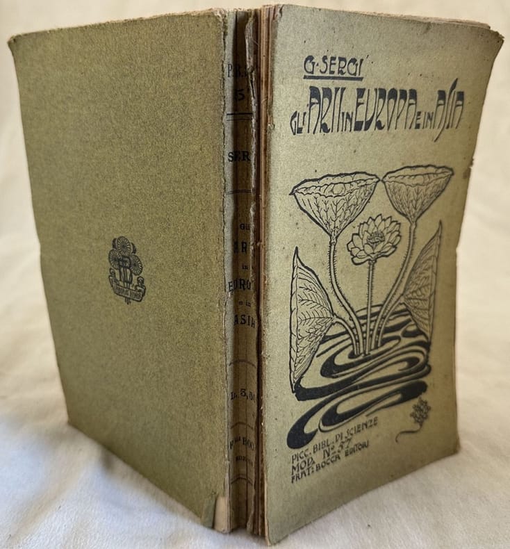 Edizione del 1903 di questo studio etnografico sugli arii in Europa e in Asia di Sergii. Numerose foto e qualche mappa ripiegata. All'interno: Arii in Europa, Arii in Asia, Arii d'Europa e Asia, Le lingue degli Arii, La coltura degli Arii primitivi, Le origini della cultura aria in Asia, La leggenda dell'origine asiatica dei popoli ecc... Dedica con firma autografa dell'autore all'occhietto. In buone condizioni. Copertina editoriale in buone condizioni con lievi usure ai margini e dorso. Legatura in discrete condizioni con rotture. All'interno le pagine si presentano in ottime condizioni con rare fioriture. In 8. Dim. 20,5x12,5 cm. Pp. VIII+(4)+272.Edition of 1903 of this ethnographic study about aryans in Europe and Asia by Sergii.<BR><BR>Different photos and folded map. Inside: Aryans in Asia, Aryans of Europe and Asia,Language of Aryans, Culture of primite aryans, Origin of culture in Asia, Legend of asiatic origin of people ecc... In good conditions. Editorial cover in good conditions lightly worn in the extremities. Binding in fair conditions with cracks. Pages in very good conditions with occasional foxings. In 8. Dim. 20,5x12,5 cm. Pp. VIII+(4)+272.