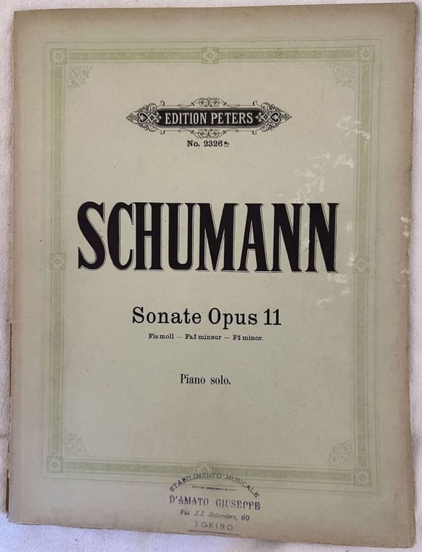 Edizione della fine dell'ottocento o inizio novecento della melodia per pianoforte "Sonate Clara zugeeignet von Florstan und Eusebius" dall'opera 11di Robert Schumann rivista da Alfred Dorffel e Adolf Ruthardt. Bella copertina editoriale illustrata. Note manoscritte. In buone condizioni. Copertina editoriale in buone condizioni generali con lievi usure ai margini. Legatura in buone condizioni. Pagine in buone condizioni con rare fioriture. In 4. Formato cm. 31x24. Pp. 48. Edition of late 19th century of early 20th century of the melody for piano "Sonate Clara zugeeignet von Florstan und Eusebius" from the opera 11by Robert Schumann reviewed by Alfred Dorffel and Adolf Ruthardt. . Beautiful editorial illustrated cover. Handwritten notes. In good conditions. Editorial cover in good general conditions lightly worn in the extremities. Binding in good conditions. Pages in good conditions with occasional foxing. In 4. Formato cm. 31x24. Pp. 48.