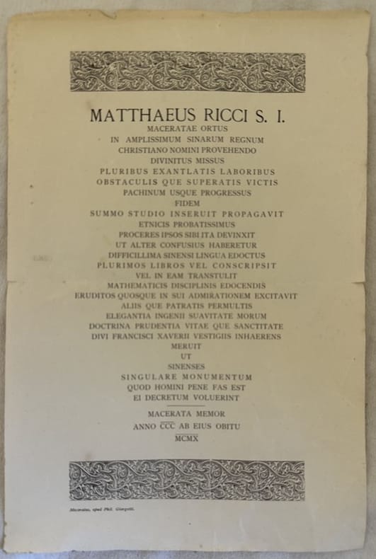 Pubblicazione originale del 1910 sulla commemorazione dl gesuita matematico e sinologo maceratese Matteo Ricci (1552-1610). Fregi. In buone condizioni. Piegature.<BR>In 8. Dim. cm 31x21.