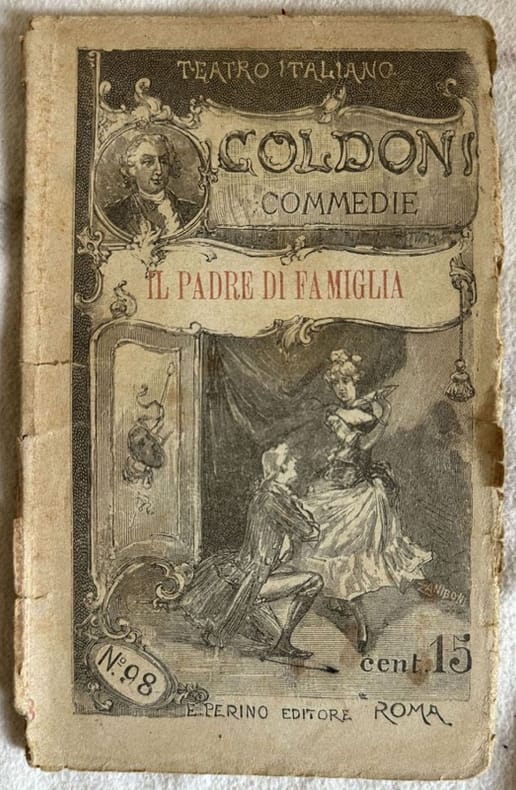 Edizione Perino del 1894 della commedia "Il padre di famiglia" di Carlo Goldoni della collana "Teatro italiano". Sono presenti due incisioni a piena pagina, una delle quali in antiporta. In buone condizioni. Copertina editoriale in discrete condizioni con lievi usure marginali. Legatura in buone condizioni. Pagine in buone condizioni generali con fioriture. In 16. Dim. 18x11 cm. Pp. 64.Perino edition of 1894 della commedia "Il padre di famiglia" by Carlo Goldoni of the series "Teatro italiano". Inside there are two engravings, one of them in the frontspice. In good conditions. Editorial cover in fair conditions lightly worn in the extremities. Binding in good conditions. Pages are in good conditions with foxing. In 16. Dim. 18x11 cm. Pp. 64.