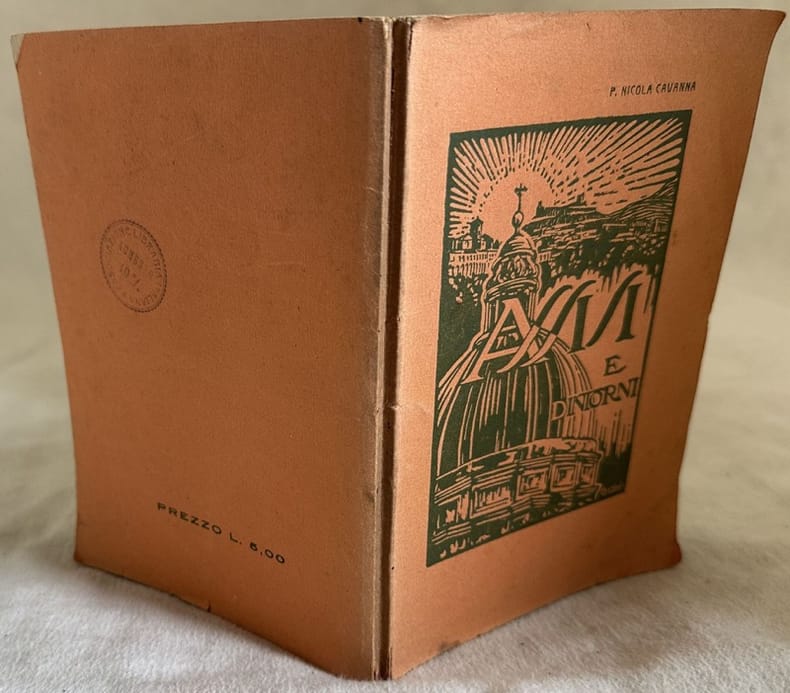 Edizione del 1921 di questa guida di Assisi scritta dal Padre Nicola Cavanna. La prima parte dell'opera è dedicata a Santa Maria degli Angeli All'interno sono presenti 53 illustrazioni qualcuna delle quali a piena pagina che rappresentano vedute ( Basilica di Santa Maria degli Angeli, Porziuncola, Il roseto di San Francesco, Assisi, Via Moiano ad Assisi, Casa Gualdi, Basilica Superiore, Piazza Vittorio Emanuele, Chiesa di San Nicolò, Chiesa Nuova, Casa del Beato Bernardo di Chiaravalle; Chiostro e Chiesa delle Carceri; Grotta del Beato Bernardo delle Carceri; Abbazia di san Benedetto sul Subasio; Antico Monastero di Panso; Chiesa di Rivotorto; Cannara; Piandarca; Abside di San Paolo presso Bastia ecc... In buone condizioni. Copertina editoriale in buone condizioni generali con lievi usure ai margini e dorso. Legatura in buone condizioni. All'interno le pagine si presentano in buone condizioni con rare fioriture. In 16. Dim. 18x13 cm. Pp. 125+(3).Edition of 1921 of this guide of Assisi written by the Father Nicola Cavanna. The firrst part is dedicated to Santa Maria degli Angeli Inside there are 53 illustrations some fo them are full page with some views ( Basilica di Santa Maria degli Angeli, Porziuncola, Il roseto di San Francesco, Assisi, Via Moiano ad Assisi, Casa Gualdi, Basilica Superiore, Piazza Vittorio Emanuele, Chiesa di San Nicolò, Chiesa Nuova, Casa del Beato Bernardo di Chiaravalle; Chiostro e Chiesa delle Carceri; Grotta del Beato Bernardo delle Carceri; Abbazia di san Benedetto sul Subasio; Antico Monastero di Panso; Chiesa di Rivotorto; Cannara; Piandarca; Abside di San Paolo presso Bastia ecc... In good conditions. Editorial cover in good general conditions lightly worn in the extremities. Binding in good conditions. Inside pages are in very good conditions with occasional foxing.In 16. Dim. 18x13 cm. Pp. 125+(3).