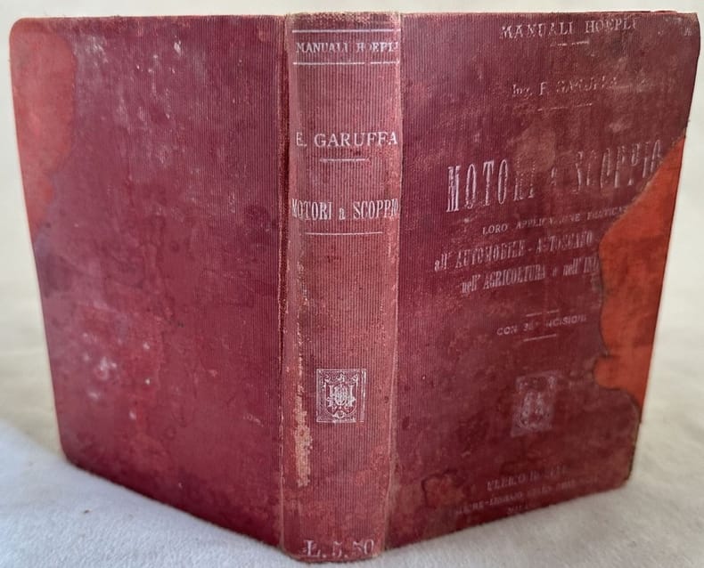 Edizione del 1910 di questo manuale Hoepli sui motori a scoppio scritto da E. Garuffa. Numerose illustrazioni nel testo. All'interno: Generalità sui motori a grande velocità ed a più cilindri; L'automobile terrestre; La navigazione automobile; La navigazione aerea; Cenno sull'impiego dei motori a scoppio veloci a cilindri semplici e multipli nell'industria e nella agricoltura ecc... In discrete condizioni. Copertina in tela editoriale in mediocri condizioni con usure e mancanze ai margini e dorso. Legatura in buone condizioni. Pagine in buone condizioni con rare fioriture. Segni di rosicchiatura di topo al margine destro delle prime 35 pagine e da pag. finale 31 a 64. In 16. cm 15x10,5 cm. Pp. X+(2)+459+64. Edition of 1910 of this Hoepli manual about combustion engines written by E. Garuffa. Different illustrations in the text. Inside: Generalità sui motori a grande velocità ed a più cilindri; L'automobile terrestre; La navigazione automobile; La navigazione aerea; Cenno sull'impiego dei motori a scoppio veloci a cilindri semplici e multipli nell'industria e nella agricoltura ecc... In fair conditions. Full cloth cover with title and decorations in the spine and plates in poor general conditions with wearings and lackings in the extremities. Binding in good conditions. Inside pages are in good conditions with occasional foxing. Signs of mouse in the right edge of the first 35 pages and from final pag.31 to 64. In 16. cm 15x10,5 cm. Pp. X+(2)+459+64. <BR><BR>