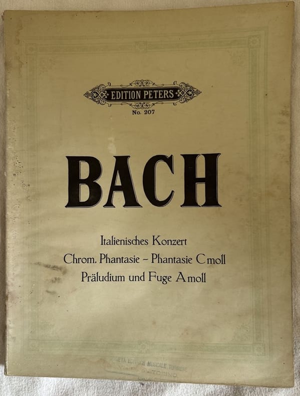 Edizione Peters di inizio novecento di alcune melodie di di Johann Sebastian Bach: Fantasia, Aria variata, Toccata, Ouverture, Fantasia. In buone condizioni Copertina editoriale in discrete condizioni con lievi usure marginali. Legatura in discrete condizioni con lievi rotture. Pagine in discrete condizioni con rare fioriture. Lievi gore d'umidità. In 4. cm.30,5x23,5. Pp. 35.Peters edition of early 20th century of some melodies by Johann Sebastian Bach: Fantasia, Aria variata, Toccata, Ouverture, Fantasia. In good conditions. Editorial cover in fair conditions lightly worn in the extremities. Binding in fair conditions with light cracks. Pages in fair conditions with occasional foxing. Light dump stains in the edges. In 4. cm.30,5x23,5. Pp. 35.