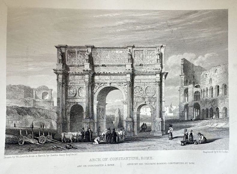Veduta dell'Arco di Costantino a Roma. Atlante: Rome and its surrounding scenery Autore: W. B. Cooke Data: 1840 circa Tecnica: Litografia Dimensione del foglio: 27,5x20,5 cm Dimensione incisione: 18x13 cm Condizioni: Buone. Alcune fioritureView of the Arch of Constantine in Rome. Atlas: Rome and its surrounding scenery Author: W. B: Cooke Date: 1840 circa Technique: Lithography Leaf Dimension:27,5x20,5 cm Engraving Dimension: 18x13 cm Conditions: Good conditions. Some foxing.