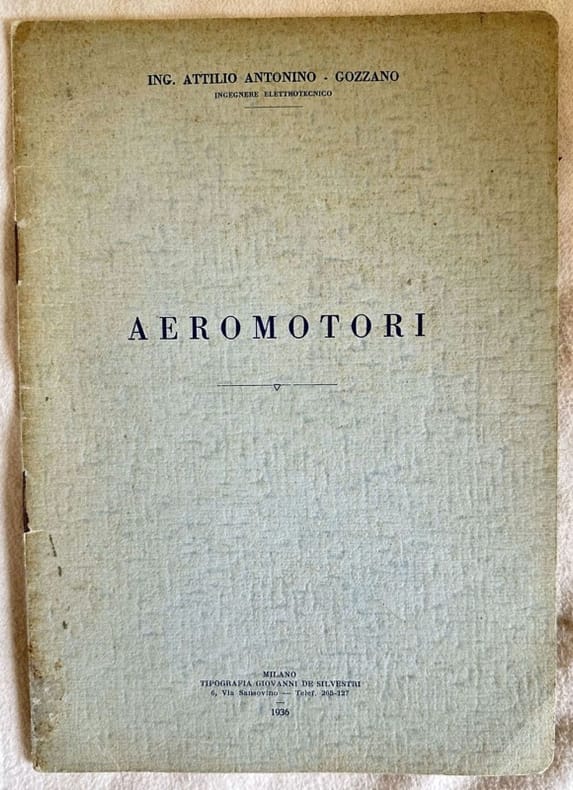Pubblicazione del 1936 sugli aeromotori scritto da Attilio Antonino Gozzano. All'interno: Aeromotori per produzione di energia elettrica; Aeromotori agricoli; All'interno numerose illustrazioni tra cui un impianto aero-elettrico ("Eolo", Giranda montata); Dettagli costruttivi del nostro aeromotore; Descrizione l'impianto di un nostro aeromotore; Montaggio; Impianti coloniali ecc... In ottime condizioni. Copertina editoriale in ottime condizioni generali con lievi usure ai margini e dorso. Legatura in buone condizioni. All'interno le pagine si presentano in ottime condizioni con rare fioriture. In 8. Dim. 24x17 cm. Pp. 28.Pamphlet of 1936 about the aeromotors written by Attilio Antonino Gozzano. Inside: Aeromotors for production for electric energy; Aeromotori agricoli; Inside there are different illustrations as impianto aero-elettrico ("Eolo", Giranda montata); Dettagli costruttivi del nostro aeromotore; Descrizione l'impianto di un nostro aeromotore; Montaggio; Impianti coloniali ecc... In very good conditions. Editorial cover in very good general conditions lgihtly worn in the extremities. Binding in good conditions. Inside pages are in very good conditions with occasional foxing. In 8. Dim. 24x17 cm. Pp. 28.