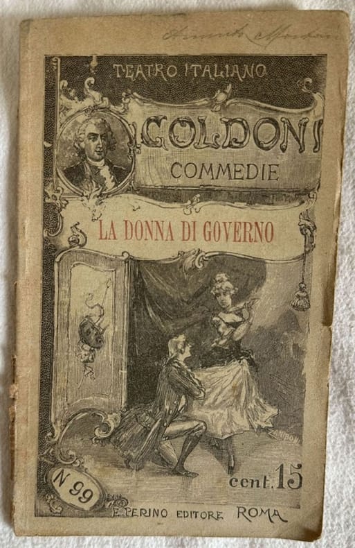 Edizione Perino del 1895 della commedia "La donna di governo" di Carlo Goldoni della collana "Teatro italiano". Sono presenti due incisioni a piena pagina, una delle quali in antiporta. In buone condizioni. Copertina editoriale in discrete condizioni con lievi usure marginali. Legatura in buone condizioni. Pagine in buone condizioni generali con fioriture. In 16. Dim. 17,5x11 cm. Pp. 64.Perino edition of 1895 of the play "La donna di governo" by Carlo Goldoni of the series "Teatro italiano". Inside there are two engravings, one of them in the frontspice. In good conditions. Editorial cover in fair conditions lightly worn in the extremities. Binding in good conditions. Pages are in good conditions with foxing. In 16. Dim. 17,5x11 cm. Pp. 64.