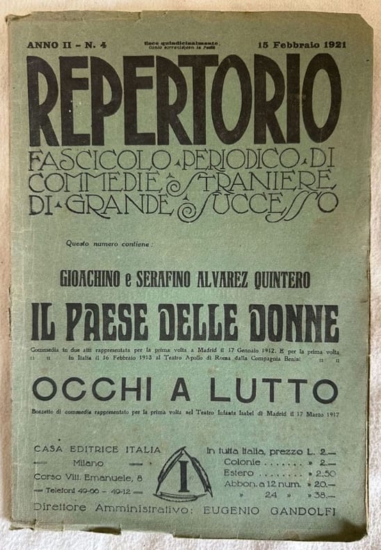 Edizione del 1921 delle commedia teatrale "Il paese delle donne" e "Occhi a lutto"di Gioachino e Serafino Alvarez Quintero della collana "Repertorio fascicolo periodico di commedie straniere di grande successo". In buone condizioni. Copertina editoriale in buone condizioni generali con lieevi usure ai margini e dorso. Legatura in buone condizioni. All'interno le pagine si presentano in buone condizioni con rare fioriture. In 8. Dim. 25x17,5 cm. Pp. 48Edition of 1921 of the theatre plays "Il paese delle donne" and "Occhi a lutto"by Gioachino e Serafino Alvarez Quintero of the series "Repertorio fascicolo periodico di commedie straniere di grande successo". In good conditions. Editorial cover in good general conditions lgihtly worn in the extremities. Binding in good conditions. Inside pages are in good conditions with occasional foxing. In 8. Dim. 25x17,5 cm. Pp. 48<BR><BR> <BR><BR>