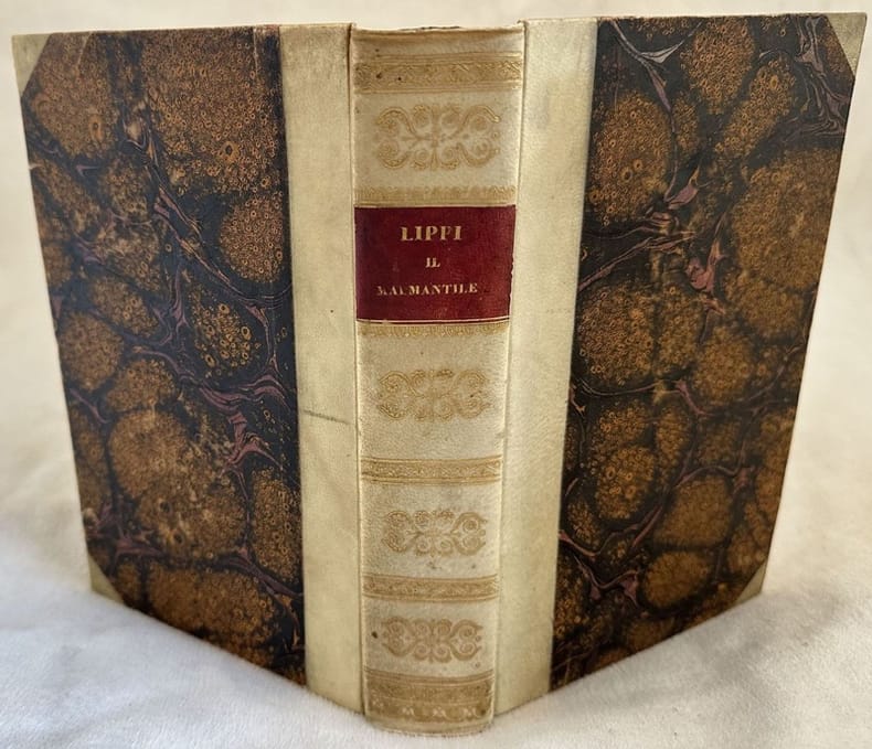 Edizione del 1807 del celebre poema eroicomico di Perlone Zipoli pseudonimo anagrammatico del pittore poeta e scrittore Lorenzo Lippi (1606-1665). Note a cura di Luigi Portirelli. L'opera, pubblicata per la prima volta nl 1676 è un poema comico ricco di motti e proverbi fiorentini ed ebbe un notevole successo. Firma di possesso nella prima carta bianca del poeta e letterato Achille Monti (1825-1879). Nota manoscritta della stessa mano all'ultima carta bianca: 23 aprile 1851. Ritratto dell'autore in antiporta. In ottime condizioni. Copertina in mezza pergamena con titolo e decorazioni in oro al dorso in ottime condizioni con lievi usure ai margini e dorso. Legatura in buone condizioni. Pagine in ottime condizioni con rare fioriture. In 8. cm 21x14 cm. Pp. XXXI+(1)+573+(1). Edition of 1807 of the famous heoricomic poem by Perlone Zipoli angagrammatic pseudonymous of the paitner, poem and writer Lorenzo Lippi (1606-1665). Notes by Luigi Portirelli. The work, published for the first time in 1676 is a comic poem rich of florentine sayings and proverbs and had an immediate success. Signature in the first blank page by the poet and man of letetrs Achille Monti (1825-1879). Handwritten note of the same hand in the last blank page: 23 aprile 1851. Portrait of the author in the frontspice. In very good conditions. Half parchment cover with gilted title and decorations in the spine in very good general conditions lightly worn in the extremities. Binding in good conditions. Inside pages are in very good conditions with occasional foxing. In 8. cm 21x14 cm. Pp. XXXI+(1)+573+(1).
