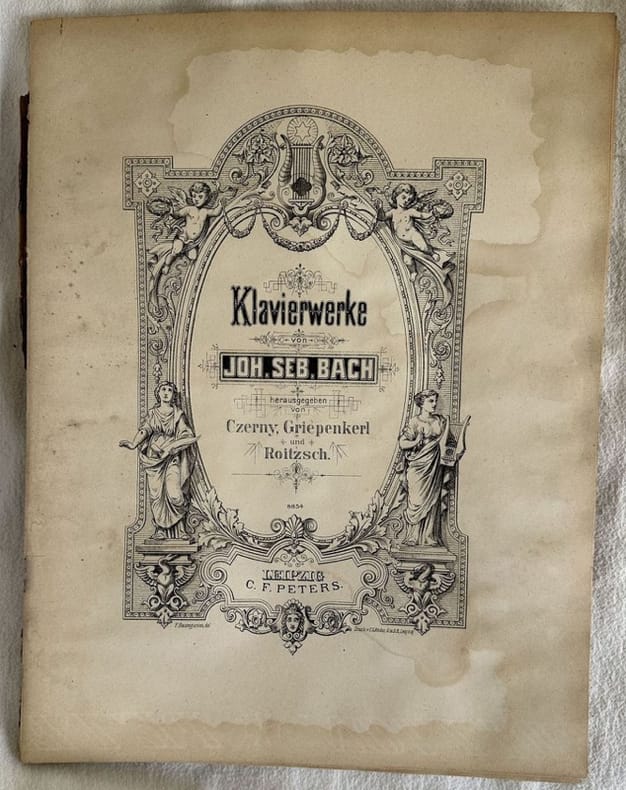 Edizione Peters di inizio novecento di alcune melodie: "Aria con variazioni" di Johann Sebastian Bach. In discrete condizioni. Copertina editoriale in discrete condizioni con lievi usure marginali. Piatti staccati. Legatura in mediocri condizioni con rotture. Pagine in discrete condizioni con rare fioriture. Lievi gore d'umidità. In 4. cm.30,5x23,5. Pp. 51. Peters edition of early 20th century of some melodies "Aria con variazioni" by Johann Sebastian Bach. In fair conditions. Editorial cover in fair conditions lightly worn in the extremities. Plates are detached. Binding in poor conditions with cracks. Pages in fair conditions with occasional foxing. Light dump stains in the edges. In 4. cm.30,5x23,5. Pp. 51.<BR>