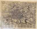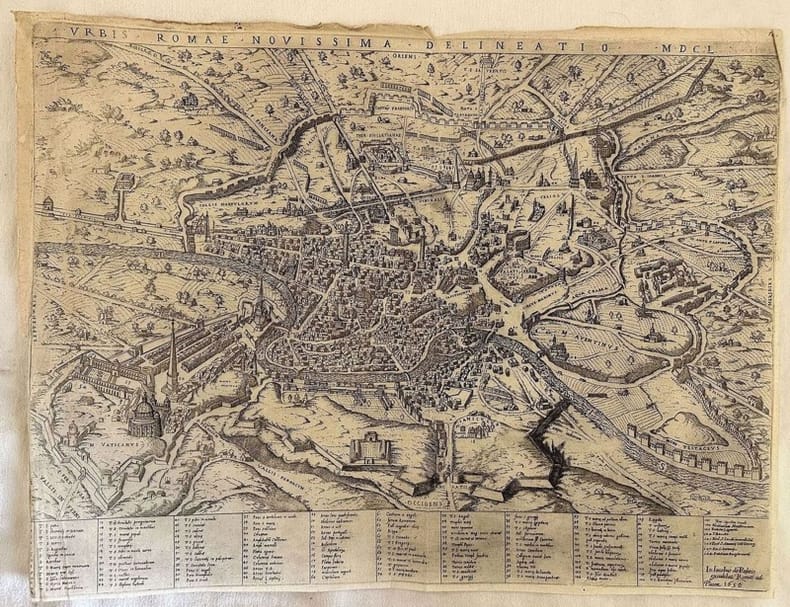 Mappa originale del 1650 della città di Roma. Molto particolareggiata le zone sono contrassegnate da numeri che rimandano a una legenda al margine inferiore per un totale di 128 luoghi. Orientazione ai quattro lati: Oriens, Meridies, Occidens, Septembrio. "Pianta prospettica della città dal Gianicolo, basata sul modello della pianta piccola del Cartaro (1575). il cui unico esemplare conosciuto della prima edizione, a firma de Cavalleris e con data 1589, è conservato nella Biblioteca Nazionale di Malta. Esemplare di quarto stato, con data nel titolo MDL e imprint Io. Iacobus de Rubeis excudebat Romae ad Pacem 1650. Legenda di 128 rimandi. L'opera viene attribuita per la prima volta a Giovan Battista de Cavalleris" (Cfr. S. Bifolco-F. Ronca, Cartografia e topografia italiana del XVI secolo. Catalogo ragionato delle opere a stampa, 2018). Mappa importante dal punto di vista storico in quanto riporta le modifiche urbanistiche introdotte da Papa Sisto V. INCISIONE: Acquaforte e bulino AUTORE: Giuseppe De Rossi DIMENSIONI FOGLIO: cm 23x26 DIMENSIONI INCISIONE: cm 9x12 EPOCA: 1650 CONDIZIONI: buone condizioni. Lievi usure marginali. Piegature. Strappo orizzontale di 4 cm restaurato. Original map of 1650 of the city of Rome. The map is rich of details and the areas are numbered and addressed to a legend with 128 places. Orientation to four sides: Oriens, Meridies, Occidens, Septembrio. "Pianta prospettica della città dal Gianicolo, basata sul modello della pianta piccola del Cartaro (1575). il cui unico esemplare conosciuto della prima edizione, a firma de Cavalleris e con data 1589, è conservato nella Biblioteca Nazionale di Malta. Esemplare di quarto stato, con data nel titolo MDL e imprint Io. Iacobus de Rubeis excudebat Romae ad Pacem 1650. Legenda di 128 rimandi. L'opera viene attribuita per la prima volta a Giovan Battista de Cavalleris" (Cfr. S. Bifolco-F. Ronca, Cartografia e topografia italiana del XVI secolo. Catalogo ragionato delle opere a stampa, 2018). A really important map from an historical point of view because it introduces the urban variation of thePope Sisto V. ENGRAVING: Burin etching AUTHOR: Giuseppe De Rossi SIZE OF PAGE: cm 54,5x41,5 SIZE OF THE ENGRAVING: cm 40x53 PERIOD: 1650 CONDITIONS: good conditions. Light wearings in the edges. Foldings. Tear of 4 cm has been restored.