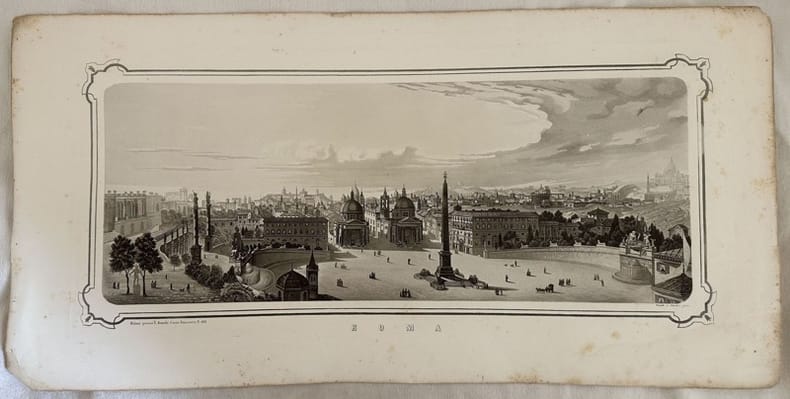 Finissima veduta del 1860 circa della città di Roma incisa da Domenico Pronti (1750-1815). La veduta mostra la prospettiva da Piazza del Popolo fino al nord di Roma e attraversando via del Babuino, via del Corso e Via di Ripetta. Presenti anche Monte Pincio e Villa Medici e le Chiese di Santa Maria di Montesanto e Santa Maria dei Miracoli e l'obelisco. In ottime condizioni. INCISIONE: Acquatinta AUTORE: Domenico Pronti e Giudici DIMENSIONI FOGLIO: cm 65x32,5 DIMENSIONI INCISIONE: cm 55x25 EPOCA: 1860 circa CONDIZIONI: buone condizioni. Lievi usure marginali. Angolo inferiore destro mancante.Very fine view of 1860 circa of the city of Rome engraved by Domenico Pronti (1750-1815). The view shows the perspectives from Piazza del Popolo until the north of Rome and going through via del Babuino, via del Corso and Via di Ripetta. There is also Monte Pincio and Villa Medici and Churches of Santa Maria di Montesanto and Santa Maria dei Miracoli and obelisk. ENGRAVING: Aquatinta AUTHOR: Domenico Pronti and Giudici SIZE OF PAGE: cm 65x32,5 SIZE OF THE ENGRAVING: cm 55x25 PERIOD: 1860 circa CONDITIONS: good conditions. Light wearings in the edges. Lower right corner lacks