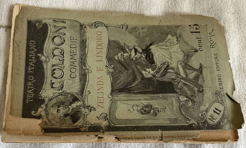 Edizione Perino del 1890 della commedia "Gli amori di Zelinda e Lindoro" di Carlo Goldoni della collana "Teatro italiano".<BR><BR>Sono presenti due incisioni a piena pagina, una delle quali in antiporta.<BR><BR>In buone condizioni.<BR><BR>Copertina editoriale in discrete condizioni con lievi usure marginali. Piatto posteriore assente. Legatura in buone condizioni. Pagine in buone condizioni generali con fioriture. In 16. Dim. 17,5x11 cm. Pp. 64.