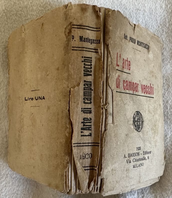 Edizione in miniatura del 1920 di questo romanzo del noto poligrafo lombardo (Monza, 1831-1910) Paolo Mantegazza. L'autore disquisisce sulla longevità nel Regno animale, vegetale e nell'uomo citando rimedi e personaggi che formularono diverse metodo per l'allungamento della vita come Paracelso, De L'Orme. Descrive inoltre la macrobiotica. In mediocri condizioni. Copertina editoriale in mediocri condizioni con usure ai margini e dorso. Piatti in parte staccati. Legatura quasi assente. Pagine in buone condizioni con fioriture. In 24. Dim. 8x5,5 cm. Pp. 215. Peso Kg. 0,032Miniature edition of 1920 of this novel by the famous poligrapher Paolo Mantegazza (Monza, 1831-1910). the author talks about the longevity in Reign of Animals and Plants and in man citing remedies and people which formulated different methods for the long of life as Paracelso, De L'Orme. He also describes macrobiotics. In poor conditions. Editorial cover in poor condition with wearings in the extremities and spine. Plates are partially detached. Binding is almost missing. Pages are in good conditions with foxing. In 24. Dim. 8x5,5 cm. Pp. 215. Peso Kg. 0,032<BR><BR>