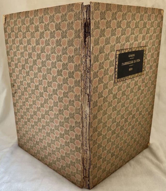 Prima rara edizione del 1831 della prima opera dell'incisore pisano Ranieri Grassi dedicata alla sua città. Dedica a Francesco Mastiani. Segue testo: descrizione del Duomo di Pisa, Battistero, Campanile di Pisa, Campo Santo, Piazza de Cavalieri, Campanile di San Nicola, Chiesa di S. Paolo a Ripa D'Arno, Santa Maria della Spina, Lungarno, Acquedotti di Nerone, Acquedotti moderni. Alla fine ventiquattro tavole incise a bulino su disegno di Francesco Giuliani, E. Gresy, G. L. Taylor: Pianta della città di Pisa, veduta della Piazza, Pianta del Battistero e vari prospetti, Piante del campanile; Piazza De Cavalieri, Campanile di S. Niccola, San Paolo a Ripa D'Arno e Chiesa di S. Maria della Spina, Lungarno, Acquedotti antichi e moderni, Ghiacciaia, Chiesa di Santo Stefano ecc... In buone condizioni. Copertina cartonata coeva con titolo manoscritto su etichetta al piatto anteriore in buone condizioni con usure e mancanze ai margini e dorso. Dorso assente. Legatura in buone condizioni. Pagine in buone condizioni con fioriture. Parti mancanti restaurate al frontespizio. In folio. cm 46x31,5. Pp. (4)+13+(1)+XXIV. Number of the 15th of august 1910 of this magazine of umbrian art. Inside: An inedit painting of Perugino; the monument to the Byshop Varino Faverino Camerte; Extreme dates of Fiorenzo di Lorenzo the date of his death; News about the art in Perugia; Local information (Bastia Umbra, Collazzone; Foligno, Gubbio, Perugia, Scandriglia; Scheggia; Urbino). Inside two plates covered by tissue paper. In good conditions Editorial cover in good conditions lightly worn in the extremities. Spine lacks. Binding ditoriarly lacks. Pages in good conditions with foxing. In 8. cm 25x17,5. Pp. 77-106.