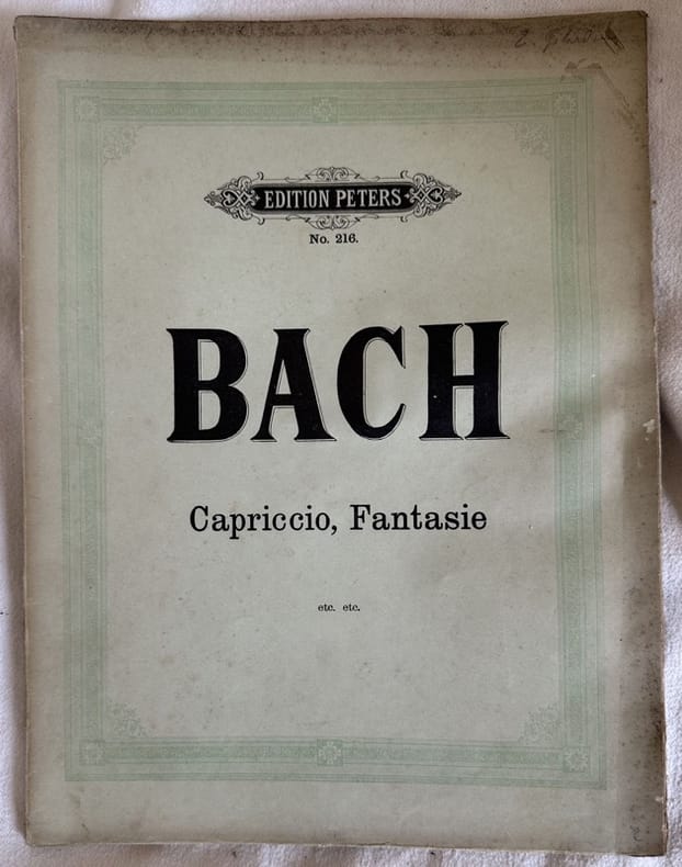 Edizione Peters di inizio novecento di alcune melodie di di Johann Sebastian Bach: Capriccio, Fantasia con imitazione; Sonata, Fuga, Drei Menuetten. In buone condizioni. Copertina editoriale in buone condizioni con lievi usure marginali. Legatura in discrete condizioni con lievi rotture. Pagine in buone condizioni con rare fioriture. Lievi gore d'umidità. In 4. cm.31,5x24. Pp. 35.Peters edition of early 20th century of some melodies by Johann Sebastian Bach: Capriccio, Fantasia con imitazione; Sonata, Fuga, Drei Menuetten. In good conditions. Editorial cover in good conditions lightly worn in the extremities. Binding in fair conditions with light cracks. Pages in good conditions with occasional foxing. Light dump stains in the edges. In 4. cm.31,5x24. Pp. 35.