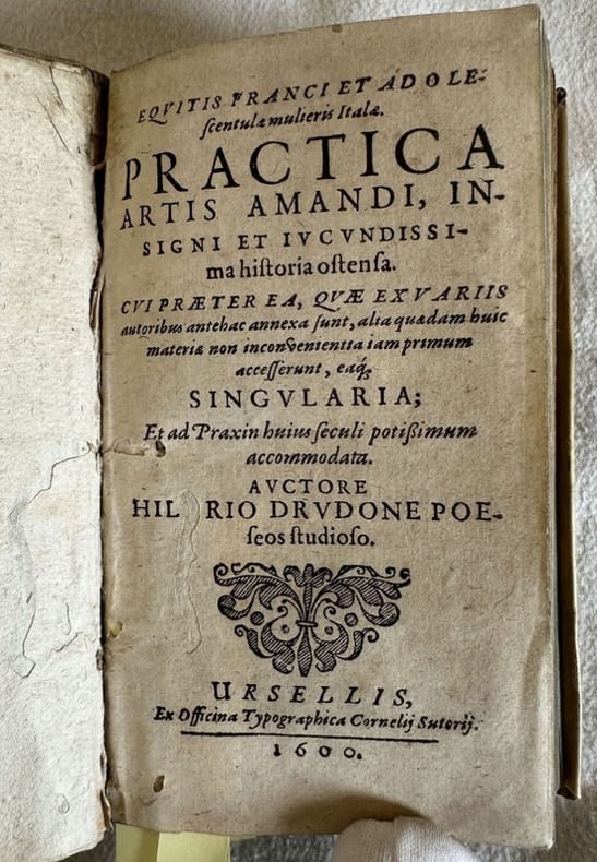 Rara edizione del 1600 di questa opera erotica. Secondo Willems l'autore è falso Non si conosce la sua identità ma Hilarius Drudo è uno pseudonimo (drudo significa amante). Rara edizione dell'unica stamperia attiva a Hessia Oberusrel nel XVI secolo. Fondata nel 1557 da Nikolaus Henricus venne gestita da Cornelius Sutor nel 1597 per terminare definitivamente l'attività nel 1623 con Wendelin Junghen. L'opera comprende una serie di opuscoli di erotica: "De duobus amantibus" di Enea Silvio Piccolomini; "Literae eroticae seu amatoriae"; Quaestio quis inter scortatorem a leactorem & ebriosum sit pessimus"; "Singularia ad maiorem huius practicae elucidationem.. idea clandestinarum desponsationum; Oratio Augusti Caesaris oratio"; "Ne feminea ornamenta bononiensis restituantur"; "Lupanaria atque ars meretricia"; "Ioannis Ioviani Pontani Dialogus"; "In effigiem amoris" di Enea Silvio Piccolomini; "Philippi Beroaldi dire in maledicam Lenam"; "Carmen amatorium Amoris imago puerilis". Marca tipografica in fine. In buone condizioni. Copertina in piena pergamena coeva con titolo manoscritto al dorso in ottime condizioni generali con lievi usure ai margini e dorso. Legatura in buone condizioni. Pagine in buone condizioni con rare fioriture. Le ultime due carte sono bianche. Piccola galleria di tarlo alle prime quattro carte con leggera perdita di testo. In 24. Dim. 13x8 cm. Pp. 495+(9).Scarce edition of 1600 of this erotic work. According to Willems the name of the author is false. His identity is unknown but Hilarius Drudo is a pseudonymous (drudo means lover). Scarce edition of the unique active publisher in Hessia Oberusrel during 16th century Established in 1557 y Nikolaus Henricus it was managed by Cornelius Sutor in 1597 to end its activity in 1623 with Wendelin Junghen. The work includes a series of pamhplets of erotica: "De duobus amantibus" by Enea Silvio Piccolomini; "Literae eroticae seu amatoriae"; Quaestio quis inter scortatorem a leactorem & ebriosum sit pessimus"; "Singularia ad maiorem huius practicae elucidationem.. idea clandestinarum desponsationum; Oratio Augusti Caesaris oratio"; "Ne feminea ornamenta bononiensis restituantur"; "Lupanaria atque ars meretricia"; "Ioannis Ioviani Pontani Dialogus"; "In effigiem amoris" di Enea Silvio Piccolomini; "Philippi Beroaldi dire in maledicam Lenam"; "Carmen amatorium Amoris imago puerilis". Typographical mark in the end. In good conditions. Full parchment coeval cover with handwritten title in the spine in very good conditions lightly worn in the extremities. Binding in good conditions. Pages in good conditions with foxing. The last two pages are white. Little worming in the first four pages with light loss of text. In 24. Dim. 13x8 cm. Pp. 495+(9).<BR><BR>