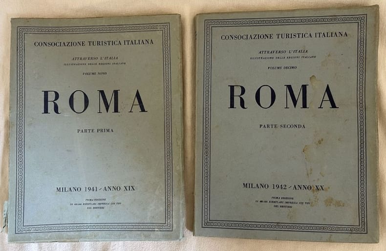 Edizione del 1941 di questa opera edita dal Touring club italiano sulla città di Roma.<BR><BR>L'opera è composta da due volumi ed è completa.<BR><BR>Il primo volume interamente dedicato alla città di Roma. La seconda parte descrive anche Città del Vaticano, dintorni (via Appia, Casal Rotondo, Villa dei Quindili, ACquedotto Claudio, Centocelle, Capannelle, Ostia Antica, Castel Fusano, Lido di Roma ecc...<BR><BR>Numerose fotografie in bianco e nero e qualcuna a colori mostrano diverse vedute e panorami. Due mappe di Roma. In discrete condizion Copertina editoriale in buone condizioni generali con lievi usure ai margini e dorso. Legatura in discrete condizioni con lievi rotture. All'interno le pagine si presentano in buone condizioni con rare fioriture. Alcune usure marginali. Strappi marginali a pag. 129 e 161, 171, da 221alla fine del tomo primo. Gore d'umidità . In 4. Dim. 29,5x22,5 cm. Pp. 237+(3), 236+(4). Peso Kg. 1,5Edition of 1941 of this work edited by Touring club italiano about the city of Rome. The work is made up of two volumes and it is complete. The first volume entirely dedicated to the city of Rome. The second part describes also Città del Vaticano, dintorni (via Appia, Casal Rotondo, Villa dei Quindili, ACquedotto Claudio, Centocelle, Capannelle, Ostia Antica, Castel Fusano, Lido di Roma ecc... Two maps of Rome. Inside there are different black and white and coloured photoes. In fair conditions. Editorial cover in good conditions lightly worn in the extremities. Binding in fair conditions with light cracks. Inside pages are in good conditions with occasional foxing. Some worn edges. Tears in the edges of pag. 129 e 161, 171, da 221at the end of first tome. Dump stains . In 4. Dim. 29,5x22,5 cm. Pp. 237+(3), 236+(4). Peso Kg. 1,5