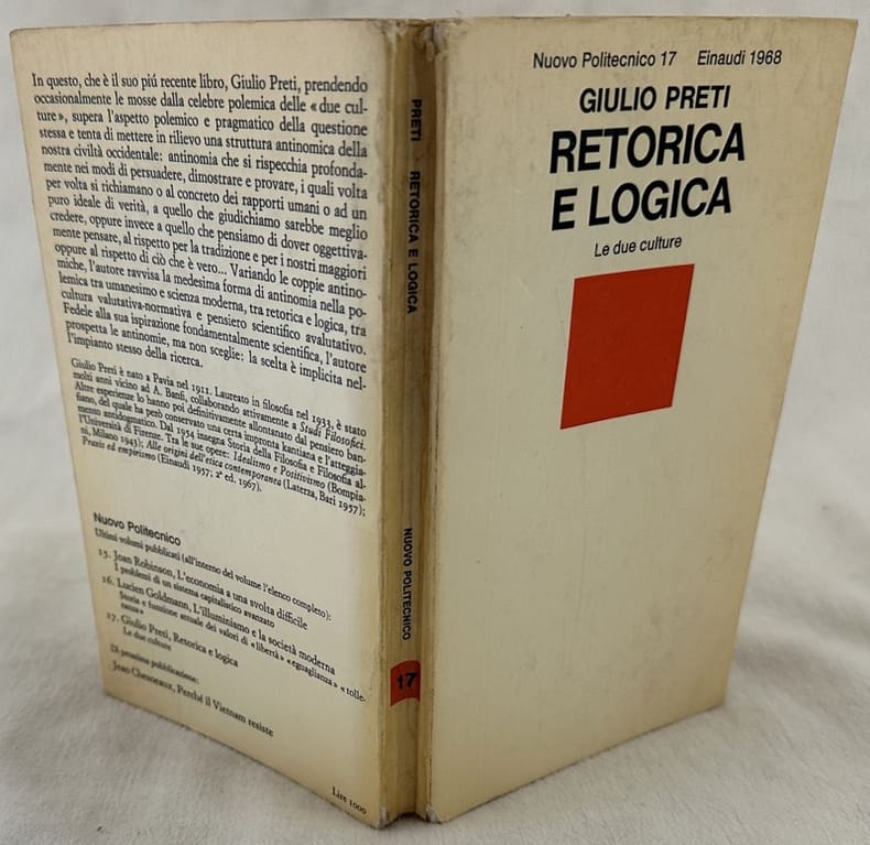 Edizione Einaudi del 1968 di questa monografia di retorica e logica di Giulio Preti. Firma al frontespizio. "In questo, che è il suo più recente libro, Giulio Preti, prendendo occasionalmente le mosse dalla celebre polemica delle "due culture" supera l'aspetto polemico e poragmatico della questione stessa e tenta di mettere in rilievo una struttura antinomica della nostra civiltà occidentalee: antinomia che si rispecchia profondamente nei modi di persuadere, dimostrare e provare, i quali volta per volta si richiamano o al concreto deiu rapporti umani o ad un puro ideale di verità..". In buone condizioni Copertina editoriale in buone condizioni generali con lievi usure ai margini e dorso. Macchie. Legatura in buone condizioni. All'interno le pagine si presentano in buone condizioni con rare fioriture. In 16. Dim. 18x10,5 cm. Pp. 242+(4).Einaudi edition of 1968 of this monography of rhetoric and logics by Giulio Preti. Signature in the title page. "In questo, che è il suo più recente libro, Giulio Preti, prendendo occasionalmente le mosse dalla celebre polemica delle "due culture" supera l'aspetto polemico e poragmatico della questione stessa e tenta di mettere in rilievo una struttura antinomica della nostra civiltà occidentalee: antinomia che si rispecchia profondamente nei modi di persuadere, dimostrare e provare, i quali volta per volta si richiamano o al concreto deiu rapporti umani o ad un puro ideale di verità..". In good conditions. Editorial cover in good conditions lightly worn in the extremities. Stains. Binding in good conditions. Inside pages are in good conditions with occasional foxing. In 16. Dim. 18x10,5 cm. Pp. 242+(4).<BR><BR>