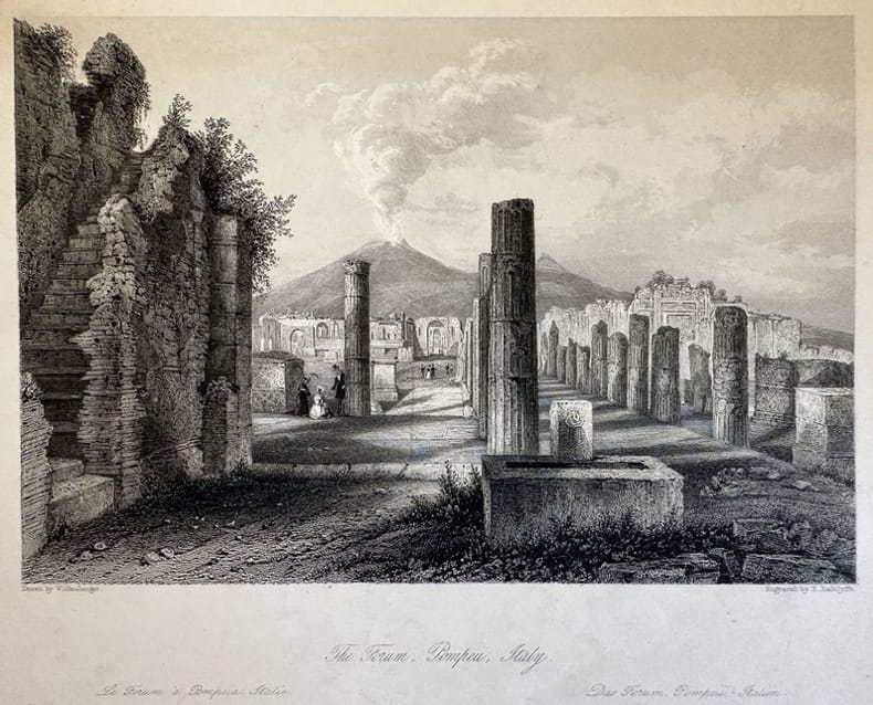 Veduta animata del 1840 circa del Foro di Pompei. Autore: W. Radclyffe su disegno di Wolfens Berger Data: 1840 circa Tecnica: Litografia Dimensione del foglio: 285x215 mm Dimensione incisione: 185x125 mm Condizioni: Buone condizioni. Fioriture.Animated view of 1840 circa of Forum of Pompei. Author: W. Radclyffe su disegno di Wolfens Berger Date: 1840 circa Technique: Lithography Leaf Dimension: 285x215 mm Engraving Dimension: 185x125 mm Conditions: Good conditions. Foxing.<BR><BR>