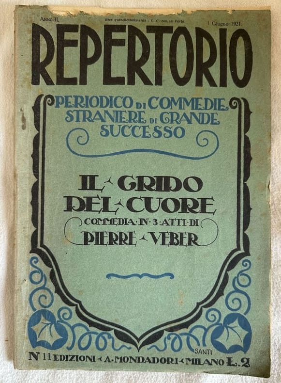 Edizione del 1 giugno 1921 delle commedia teatrale "Il grido del cuore" di Pierre Veber della collana "Repertorio fascicolo periodico di commedie straniere di grande successo". In buone condizioni. Copertina editoriale in buone condizioni generali con lieevi usure ai margini e dorso. Legatura in buone condizioni. All'interno le pagine si presentano in buone condizioni con rare fioriture. In 8. Dim. 24,5x17,5 cm. Pp. 41+(7).Edition of 1921 of the theatre play "Il grido del cuore" by Pierre Veber of the series "Repertorio fascicolo periodico di commedie straniere di grande successo". In good conditions. Editorial cover in good general conditions lgihtly worn in the extremities. Binding in good conditions. Inside pages are in good conditions with occasional foxing. In 8. Dim. 24,5x17,5 cm. Pp. 41+(7).<BR><BR>