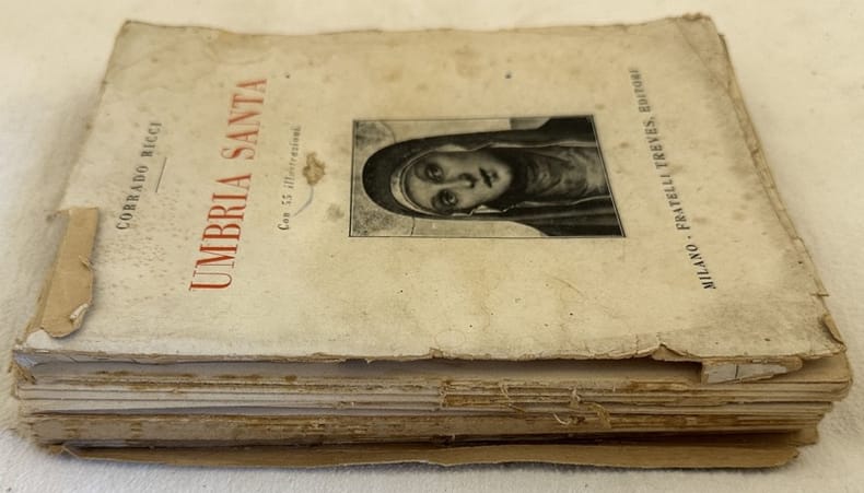 Interessante monografia del 1926 sull'Umbria scritta dall'archeologo e storico Corrado Ricci (1858-1934). All'interno: Umbria Santa, Il paesaggio francescano, Visioni Francescane in Dante e in Giotto, Santa Rita, Il Perugino, Il Pintoricchio, Luca Signorelli, Fra voti e capestri, La Madonna del Popolo di Montefalco ecc... All'interno 54 tavole fotografiche più una in copertina che mostrano quadri e vedute (San Benedetto a Norcia, Duomo di Spoleto, Consolazione a Todi, Gubbio, Carceri al Subasio, Assisi, San Damiano, Santa Chiara, Santa Maria degli Angeli, isola Maggiore del Trasimeno, La Verna, San Francesco, Roccaporena, Rocca di Citta della Pieve, Duomo di Orvieto, Tombe etrusche sotto Orvieto). In mediocri condizioni. Copertina editoriale in mediocri condizioni con usure e mancanze ai margini e dorso. Piatti staccati. Legatura quasi mancante. Pagine in buone condizioni con fioriture. In 8. cm. 20,5x15. Pp. 199+(5)+54 pl..Interesting monography of 1926 about Umbria written by the historian and archeologist Corrado Ricci. inside: Umbria Santa, Il paesaggio francescano, Visioni Francescane in Dante e in Giotto, Santa Rita, Il Perugino, Il Pintoricchio, Luca Signorelli, Fra voti e capestri, La Madonna del Popolo di Montefalco ecc... Inside there are 54 photographi plates (an additional one in the cover) (San Benedetto a Norcia, Duomo di Spoleto, Consolazione a Todi, Gubbio, Carceri al Subasio, Assisi, San Damiano, Santa Chiara, Santa Maria degli Angeli, isola Maggiore del Trasimeno, La Verna, San Francesco, Roccaporena, Rocca di Citta della Pieve, Duomo di Orvieto, Tombe etrusche sotto Orvieto). In poor conditions. Editorial cover in poor conditions lightly worn in the extremities. Plates are detached. Binding is almost missing. Pages in good conditions with occasional foxing. In 8. cm. 20,5x15. Pp. 199+(5)+54 pl..